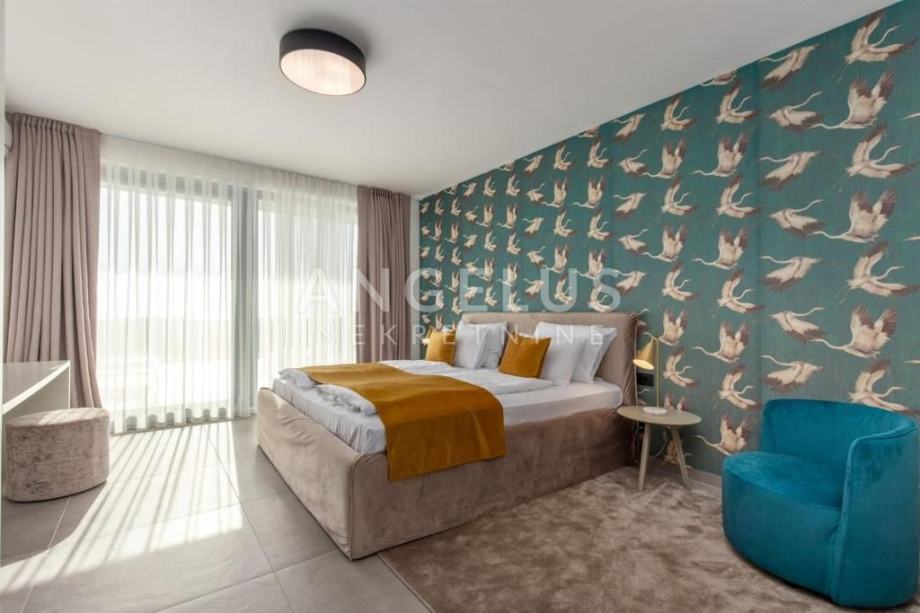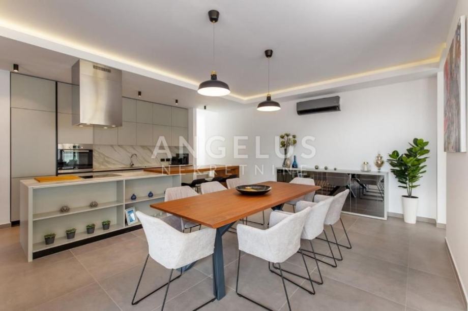 Ulaskom u prizemlje, dočekuje vas otvoreni prostor koji sadrži potpuno opremljenu kuhinju, blagovaonicu i dnevni boravak sa modernim namještajem. Prostor je obasjan prirodnim svjetlom, zahvaljujući velikim staklenim prozorima od poda do stropa koji ne samo da osvjetljavaju unutrašnjost, već također pružaju pogled na vanjski vrt.