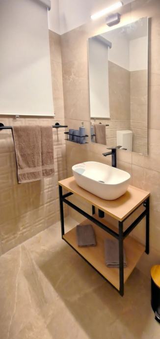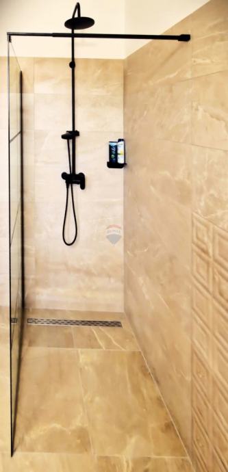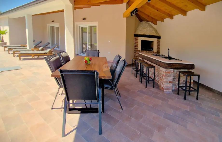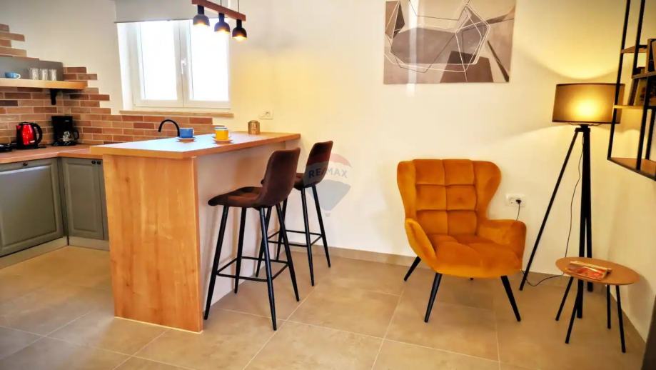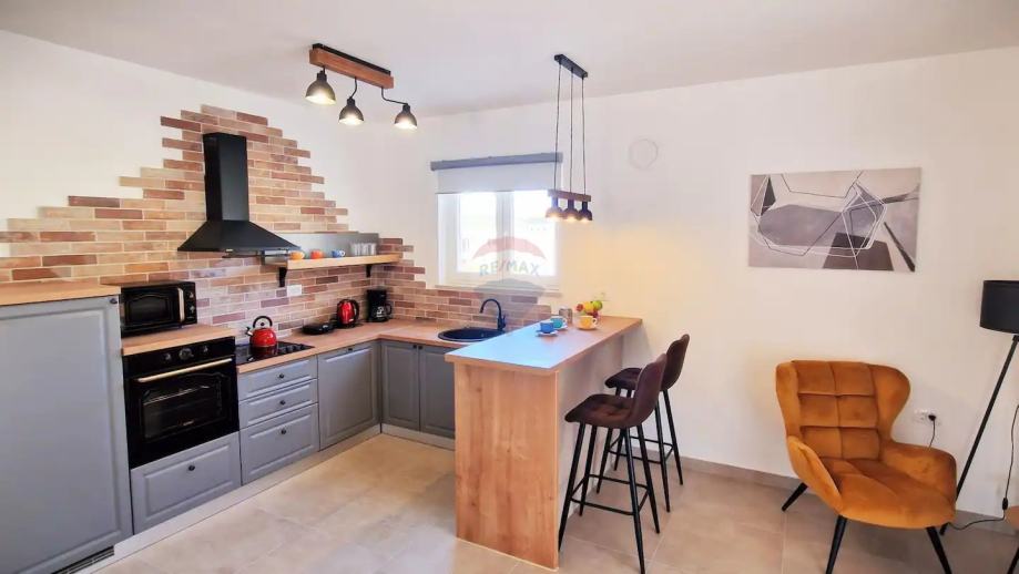 U prizemlju se kroz natkriveni ulaz ulazi u kuću, odnosno predsoblje te veliki dnevni prostor - dnevni boravak, kuhinju i blagovaonicu iz kojih se izlazi na natkrivenu terasu s kaminom i ljetnom kuhinjom idealnom za tople ljetne mjesece. U prizemlju je i jedna kupaonica, dok se na prvom katu nalaze dvije spavaće sobe, svaka sa svojom kupaonicom.