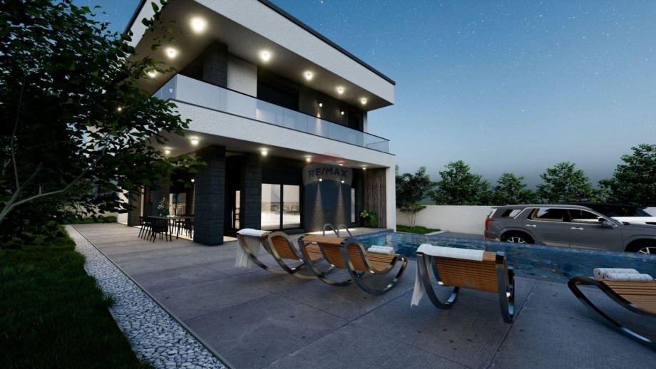 U prizemlju je dnevni boravak s kuhinjom, izlaz na natkrivenu terasu i bazen 32 m2, kupaonica i ostava a na katu 3 spavaće sobe svaka sa svojom kupaonicom te izlazom na balkon. Kuća će imati puno prirodnog svjetla s otvorenim prostorom i staklenim stijenama. Kuća će biti opremljena s podnim grijanjem i dizalicom topline.