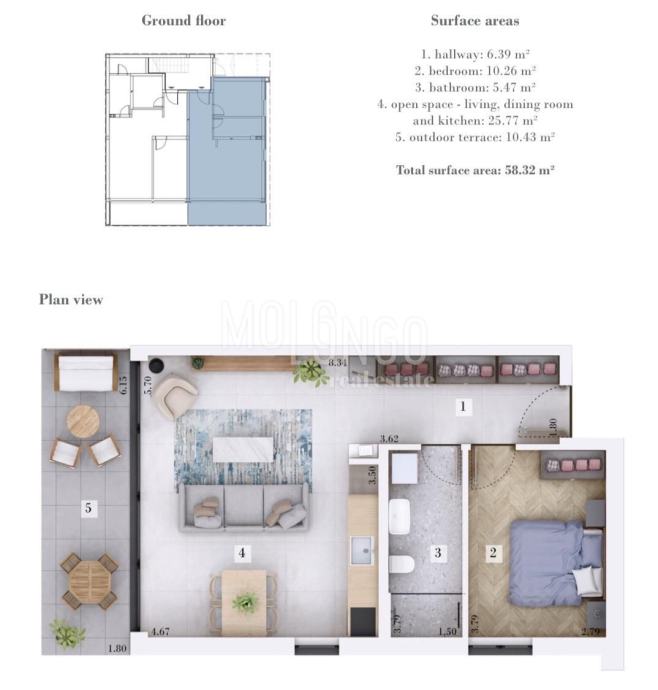 Ovaj stan utjelovljuje suvremeni način života svojim otvorenim konceptom, gdje se dnevni boravak, blagovaonica i kuhinja skladno stapaju u prostranu i funkcionalnu cjelinu. Glavna spavaća soba pruža udobno utočište, dok prostrana kupaonica unosi dašak luksuza u vašu svakodnevicu. Ulazni hodnik nudi praktična rješenja za pohranu, osiguravajući urednost i organiziranost prostora. Izađite na prostranu terasu, prirodni produžetak dnevnog boravka, i uživajte u neposrednom pristupu bujnom vrtu koji se prostire pred vama.