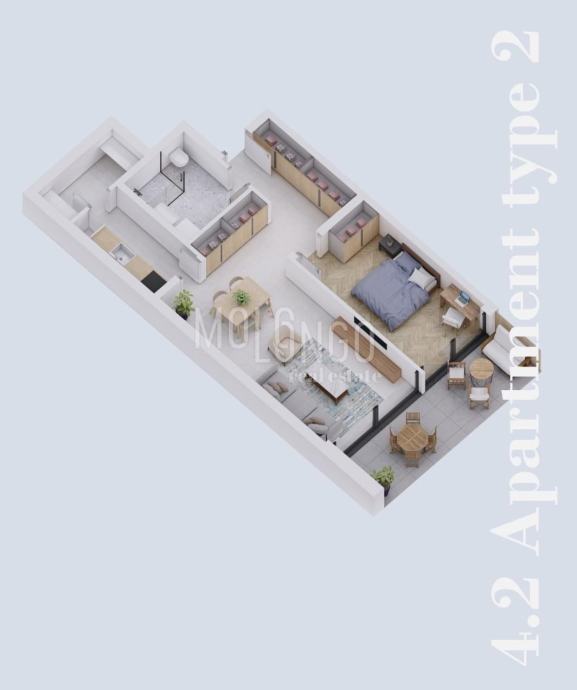 Ovaj prizemni stan pažljivo je osmišljen kako bi stvorio osjećaj prostranosti i topline. Otvoreni dnevni boravak s kuhinjom i blagovaonicom pretvara se u srce doma, gdje se mirisi domaćih jela i zvuk smijeha prirodno stapaju s pogledom na privatnu terasu i vrt. Velike staklene stijene donose obilje sunčeve svjetlosti, a večernji zalasci pretvaraju ovaj kutak u pravo utočište mira i romantike.