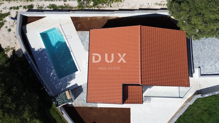 Velike staklene stijene smještene u dnevnom dijelu kuće, vode na natkrivenu terasu te na prostranu okućnicu površine 790 m2 na kojoj je smješten veliki bazen dimenzija 10 m x 4.5 m sa sunčalištem.