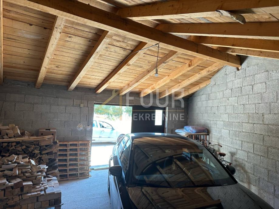 Uz kuću dolazi pomoćni objekt - spremište, drvarnica + vanjski wc, garaža + dva vanjska parkirna mjesta.