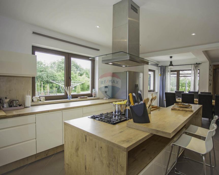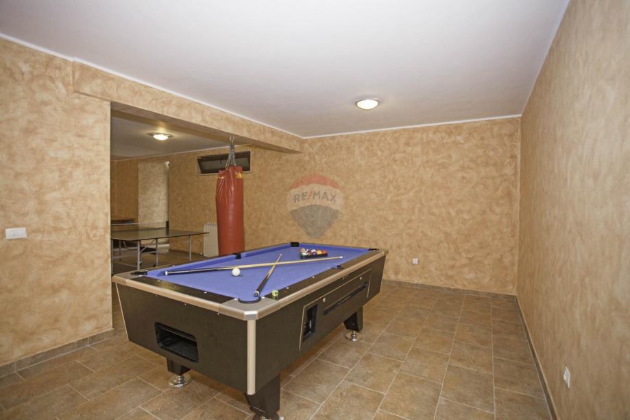 U podrumu površine 100m2 se nalazi kamin, biljar, fitness i kupaonica. Tu je još i garaža te radiona.