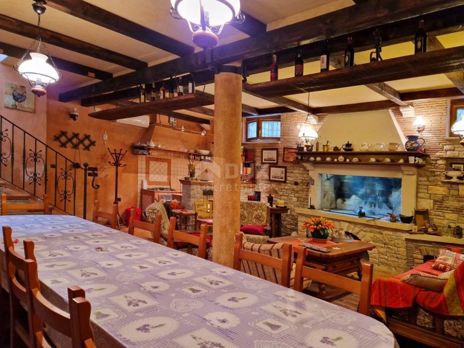 Dnevni prostor je unutarnjim stepeništem povezan sa suterenom u kojem se nalazi autentična konoba; prostor za druženje s otvorenim kaminom, kuhinjom i kupaonicom.