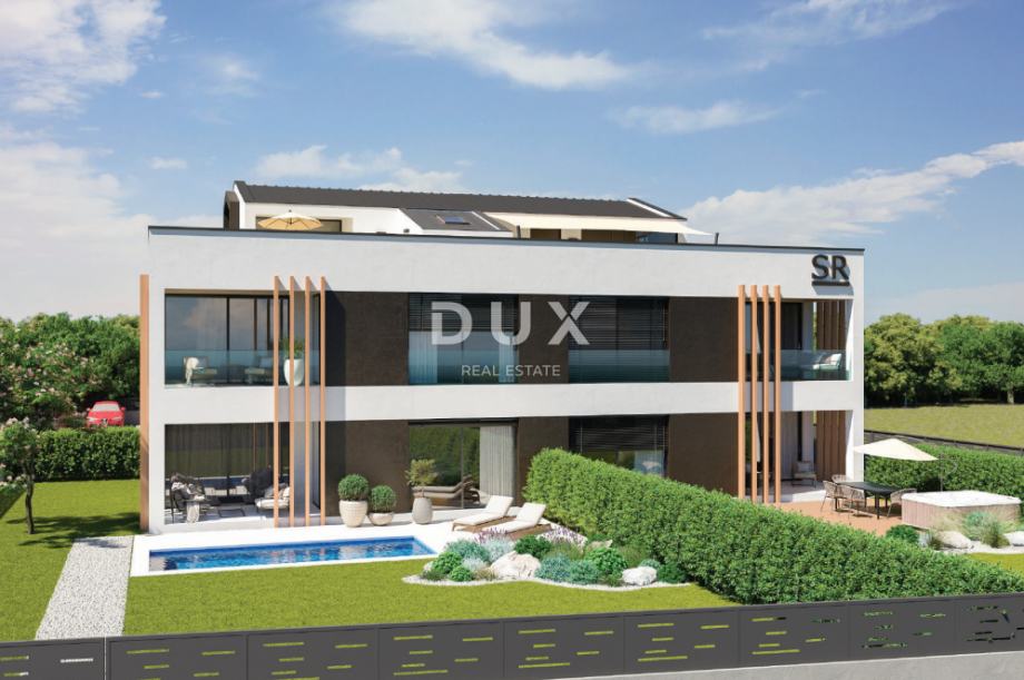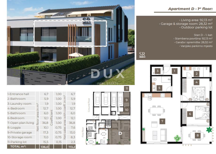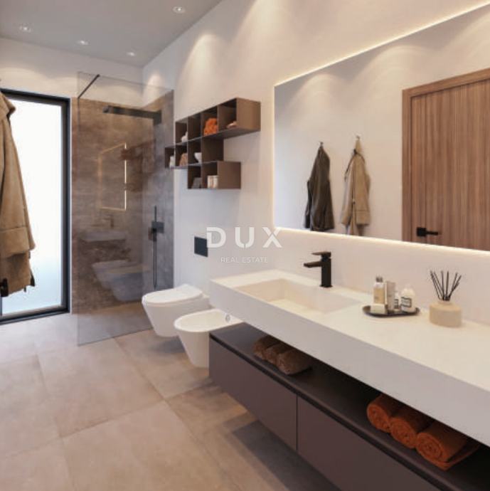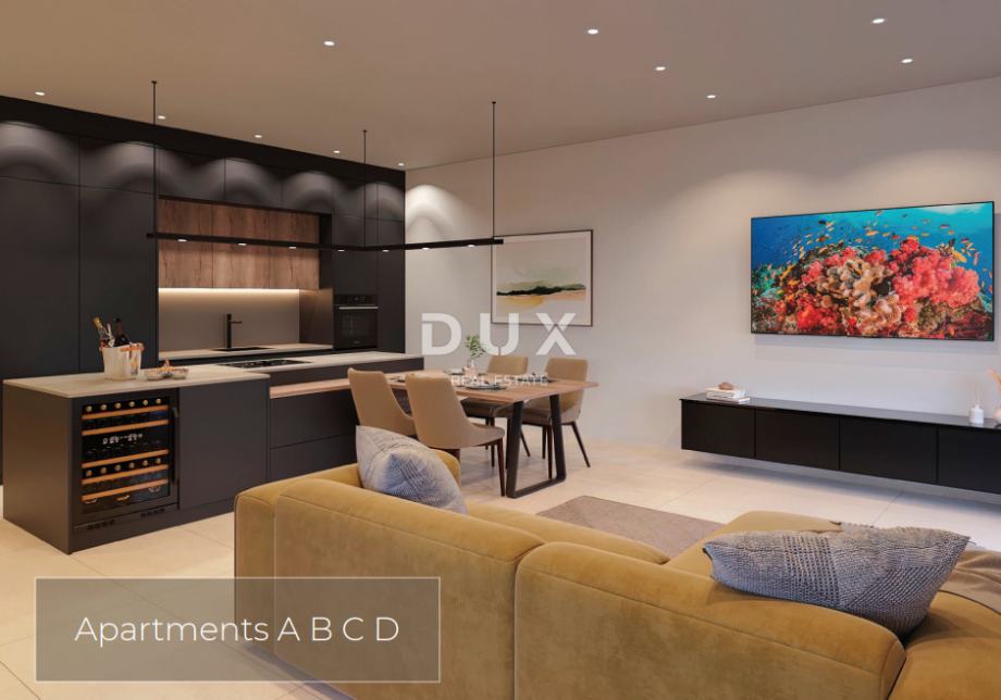 Stan se nalazi na prvome katu te se sastoji od dvije spavaće sobe i dvije kupaonice, prostranog open-space prostora koji obuhvaća kuhinju, blagovaonicu i dnevni boravak, praonice, loggie, terase te skladišta. Nekretnini pripadaju parkirno mjesto i garaža a nalazi se svega nekoliko stotina metara od mora.
