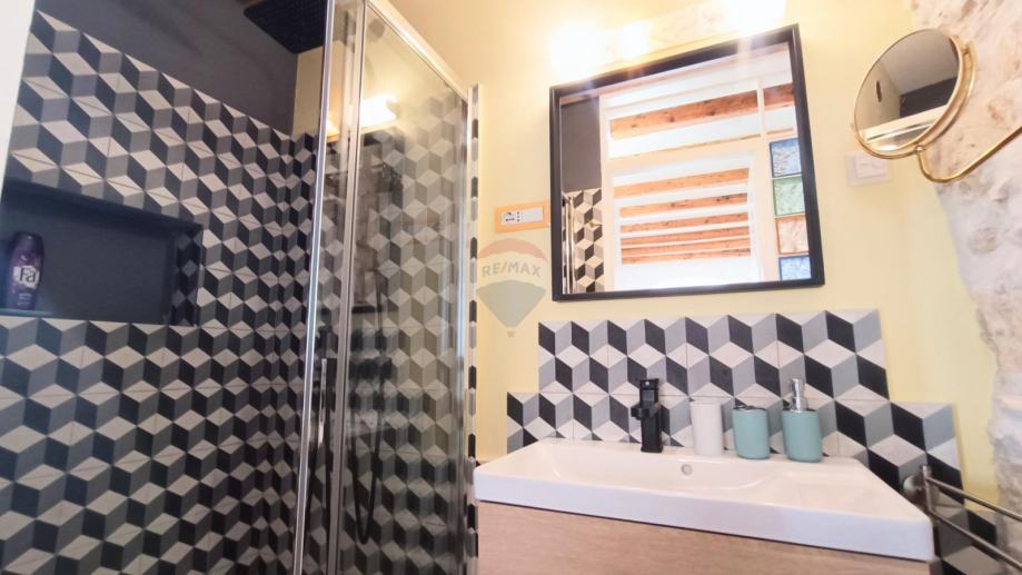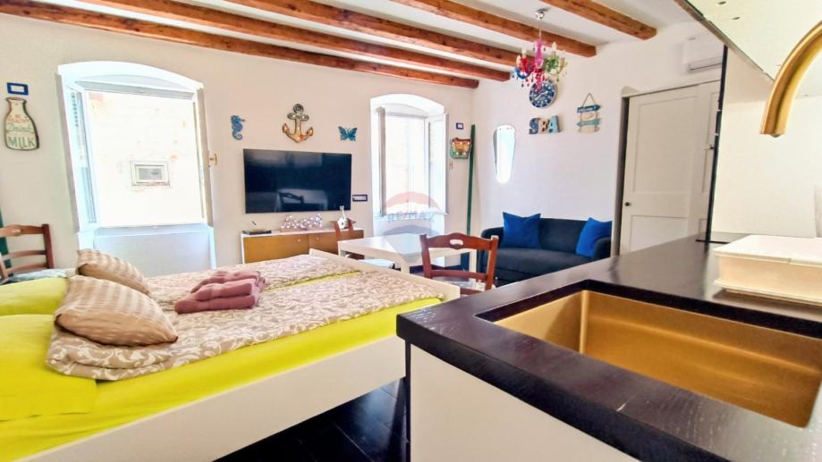 Sastoji se od ulaznog prostora, zasebne kupaonice i WC-a, prostranog spremišta te glavne stambene prostorije. Posebnost ovog apartmana je pogled na more, što ga čini izuzetno privlačnim i ugodnim za boravak.