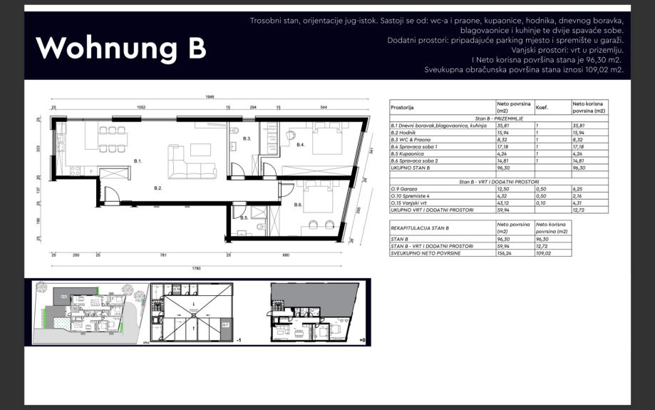 Istra, Rovinj, u manjoj stambenoj zgradi sa 6 stanova na odličnoj lokaciji, moderan stan B u prizemlju, zatvorene stambene površine 96,30m2.Stan se sastoji od toaleta i vešeraja, kupaonice, hodnika, open space koncepta dnevnog boravka, blagovaonice i kuhinje te dvije spavaće sobe.Stan dolazi s...
