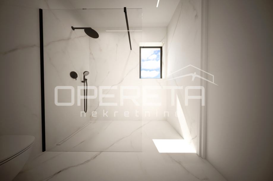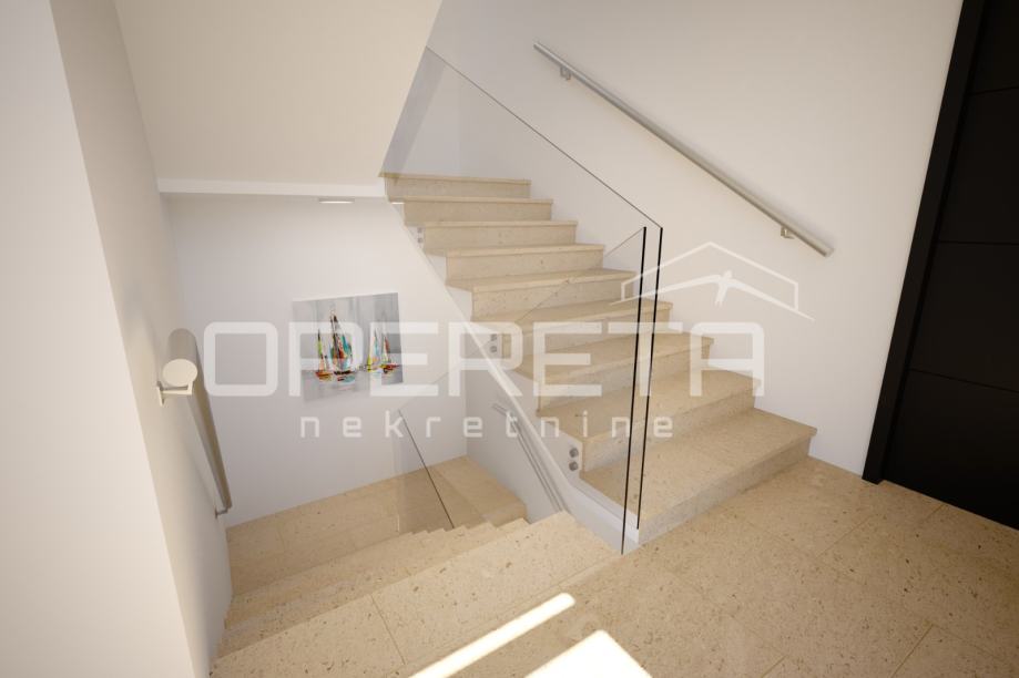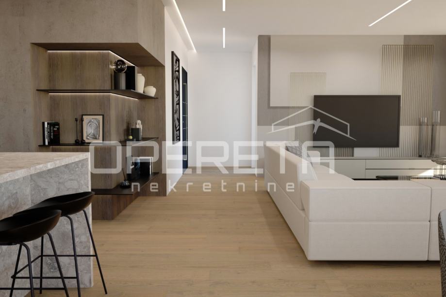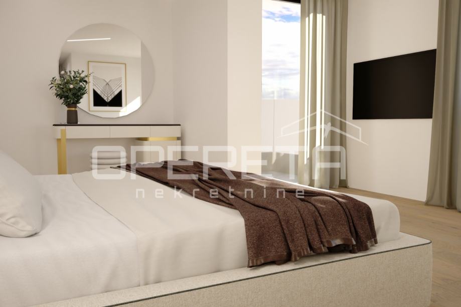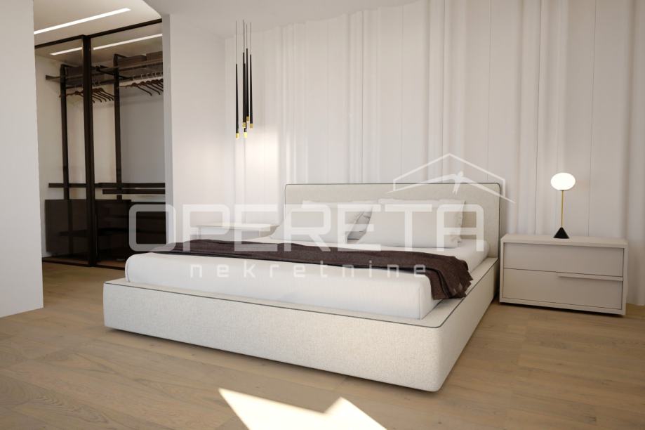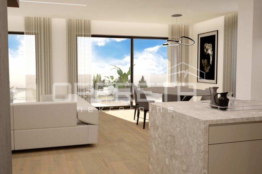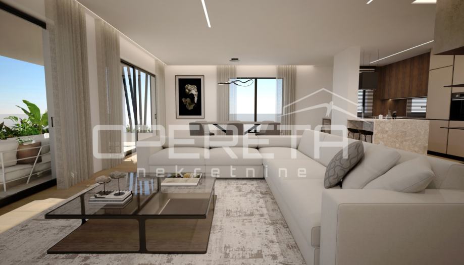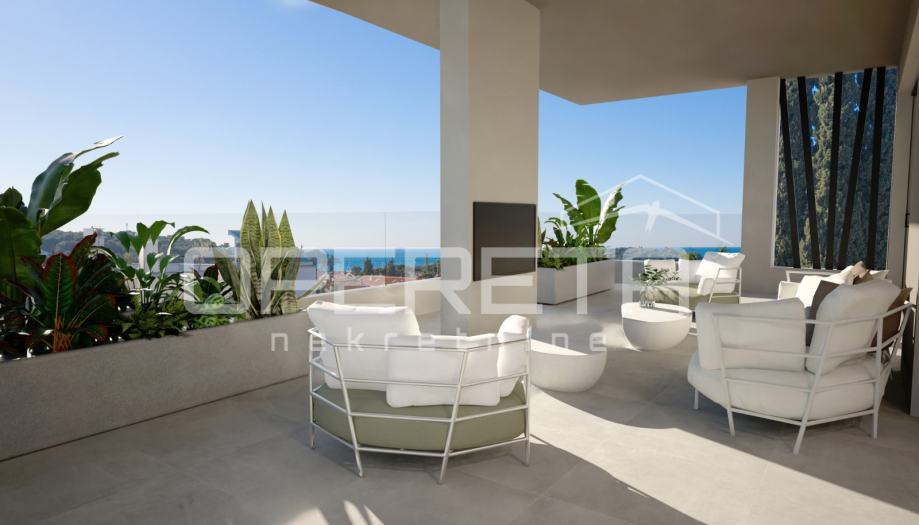 Prostrani dnevni boravak s kuhinjom i blagovaonicom i Izlazom na veliku terasu od 32 m² s koje se pruža prekrasan pogled na grad i more, dvije master spavaće sobe, svaka s vlastitom kupaonicom i garderobom, dodatna spavaća soba također s vlastitom kupaonicom. Jedna master soba ima i vlastiti balkon.