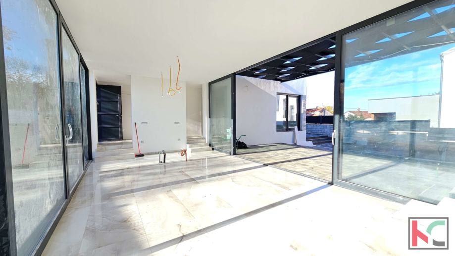 Sastoji se od otvorenog dnevnog boravka sa kuhinjom koji je većinom ostakljen i bogat svjetlom te se može većim dijelom otvoriti čime dobivate osjećaj natkrivene terase koja vas dijeli par koraka od bazena.