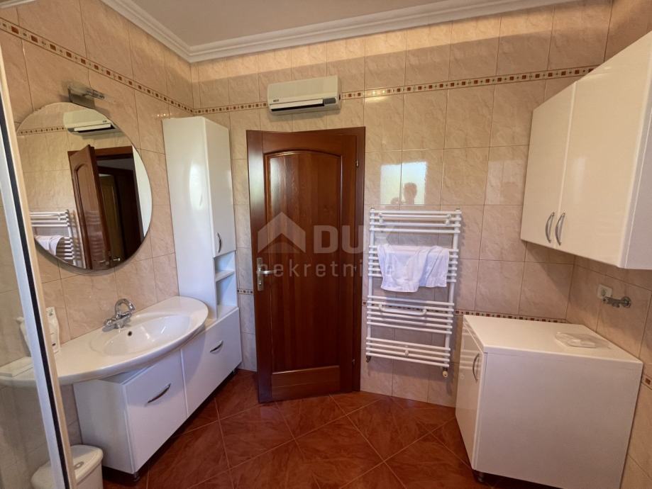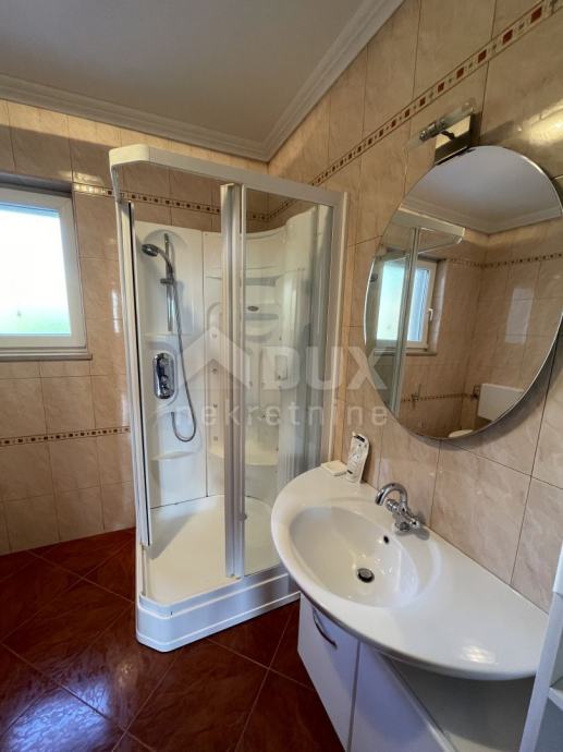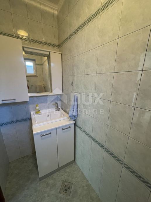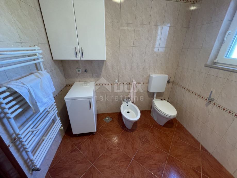 Ulaskom u prizemlje kuće ulazimo u prvi stan. Donji stan se sastoji od dnevnog boravka s kuhinjom, jednog WC-a, kupaone, dvije spavaće sobe, spremišta i garderobe. U sobama se nalazi parket koji je zdrav i očuvan, a kroz stan u prizemlju moguće je i izaći na terasu s koje se pruža predivan pogled na more.