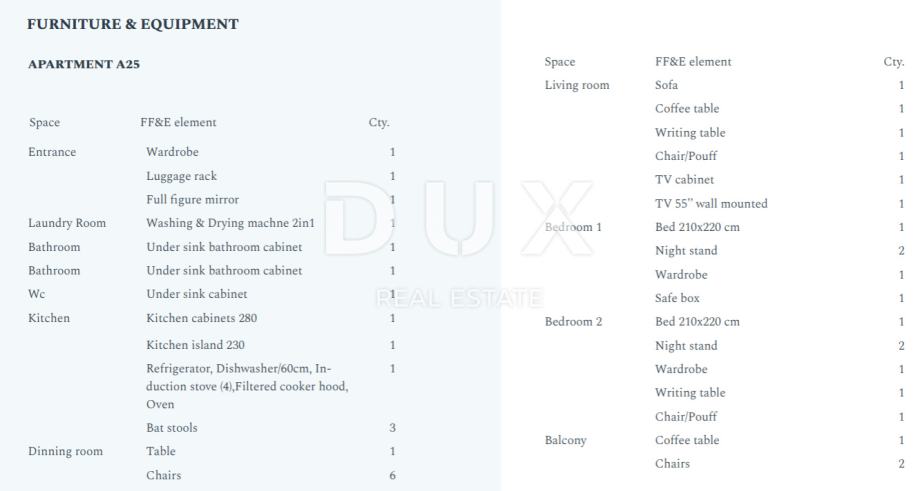 Prodaje se prostrani moderno opremljen apartman smješten u mirnom okruženju, na atraktivnoj lokaciji u blizini mora i na pješačkoj udaljenosti od plaža. Stan se sastoji od dvije velike spavaće sobe, dvije kupaonice od kojih je jedna spojena sa većom spavaćom sobom, i dodatnim WC-om te prostranim otvorenim prostorom koji obuhvaća dnevni boravak, blagovaonicu i kuhinju. Dnevni boravak i 2 spavaće sobe povezane su velikim balkonom koji ima pogled na park. Apartmanu pripada 1 parkirno mjesto.