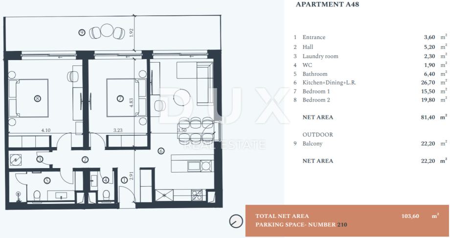 Kvadrature:103,60m2=81,40 unutarnji prostor+22,20 balkon