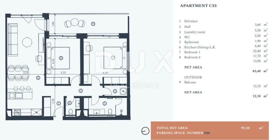 Kvadrature:95,60m2=83,40 unutarnji prostor+12,10 balkon
