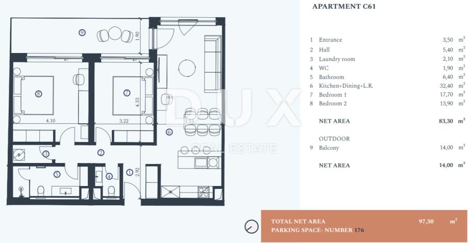 Kvadrature:97,30m2=83,30 unutarnji prostor+14,00 balkon