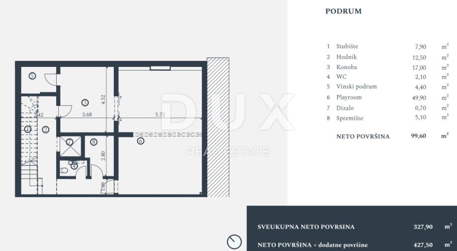 Podrum: konoba, WC, vinski podrum, prostorija za igru (playroom) i spremište.