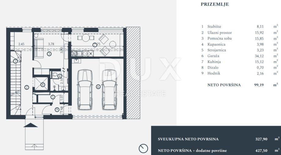 Prizemlje: kupaonica, strojarnica, garaža i pomoćna soba.