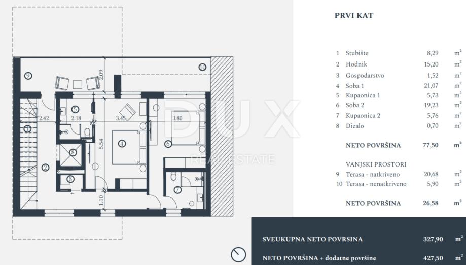 Drugi kat: kuhinja, blagovaonica i dnevni boravak smješteni u prostranom otvorenom konceptu, WC te glavna spavaća soba s vlastitom kupaonicom. Na ovoj etaži nalazi se i velika terasa s panoramskim pogledom na more.