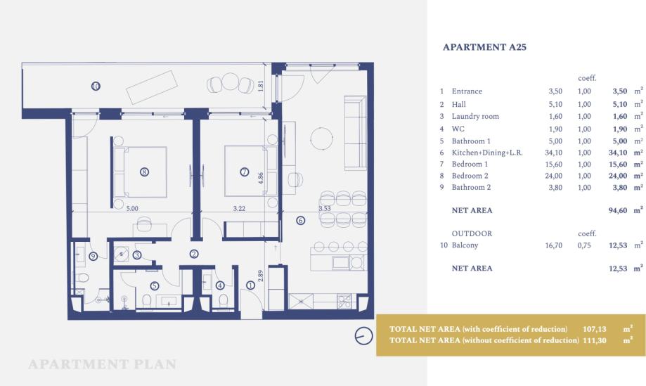 Istra, Savudrija, moderan apartman s dvije spavaće sobe na drugom katu zatvorene površine 94,60 m2 u sklopu Petram Resorta. Apartman A25 se sastoji od ulaznog dijela, hodnika, vešeraja, toaleta, gostinjske kupaone, open space dnevnog boravka, kuhinje i blagovaone, dvije prostrane spavaće sobe...