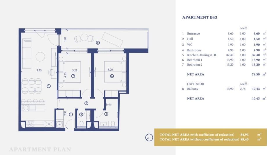 Istra, Savudrija, moderan apartman s dvije spavaće sobe na drugom katu zatvorene površine 74.50 m2 u sklopu Petram Resorta. Apartman B43 se sastoji od ulaznog dijela, hodnika, vešeraja, toaleta i kupaone, open space prostranog dnevnog boravka, kuhinje i blagovaone, dvije komforne spavaće sobe...