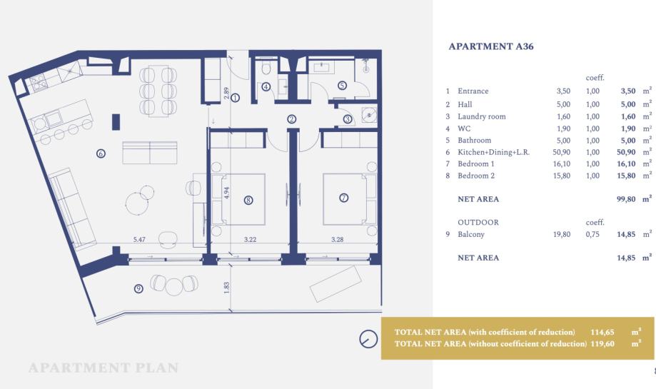 Istra, Savudrija, moderan apartman s dvije spavaće sobe na drugom katu zatvorene površine 99.80 m2 u sklopu Petram Resorta.Apartman A36 se sastoji od ulaznog dijela, hodnika, vešeraja, toaleta, gostinjske kupaone, velikog open space dnevnog boravka, kuhinje i blagovaone, dvije prostrane spavaće...
