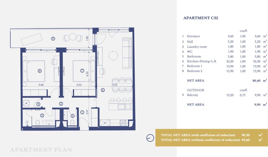 Istria, Savudrija, a modern two-bedroom apartment on the second floor with a net usable area of 80.40 m², located within the Petram Resort. Apartment C32 consists of an entrance area, hallway, laundry room, toilet, bathroom, open-space living room, kitchen and dining area, two spacious bedrooms,...