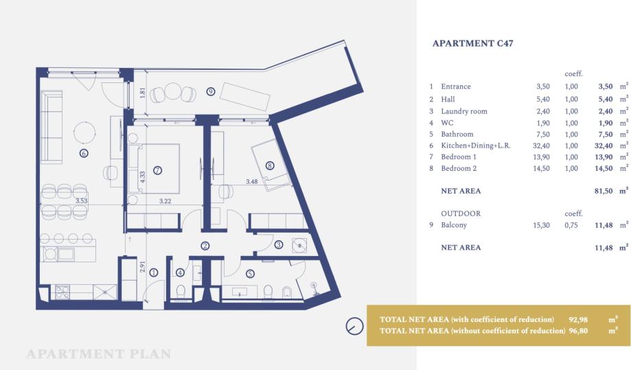 Istra, Savudrija, moderan apartman s dvije spavaće sobe na drugom katu zatvorene površine 81.50 m2 u sklopu Petram Resorta. Apartman C47 se sastoji od ulaznog dijela, hodnika, vešeraja, toaleta i kupaone, open space dnevnog boravka, kuhinje i blagovaone, dvije prostrane spavaće sobe te balkona....