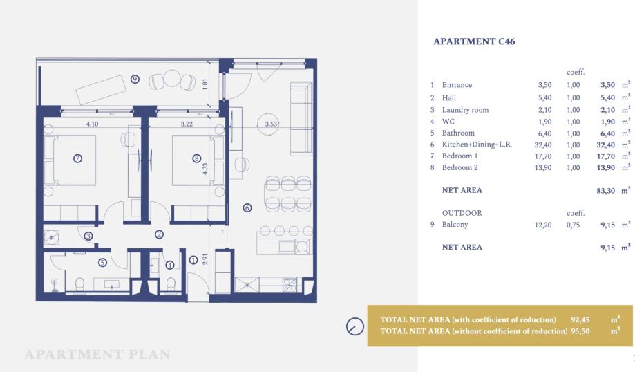 Istra, Savudrija, moderan apartman s dvije spavaće sobe na drugom katu zatvorene površine 83.30 m2 u sklopu Petram Resorta. Apartman C46 se sastoji od ulaznog dijela, hodnika, vešeraja, toaleta i kupaone, open space dnevnog boravka, kuhinje i blagovaone, dvije prostrane spavaće sobe te balkona....
