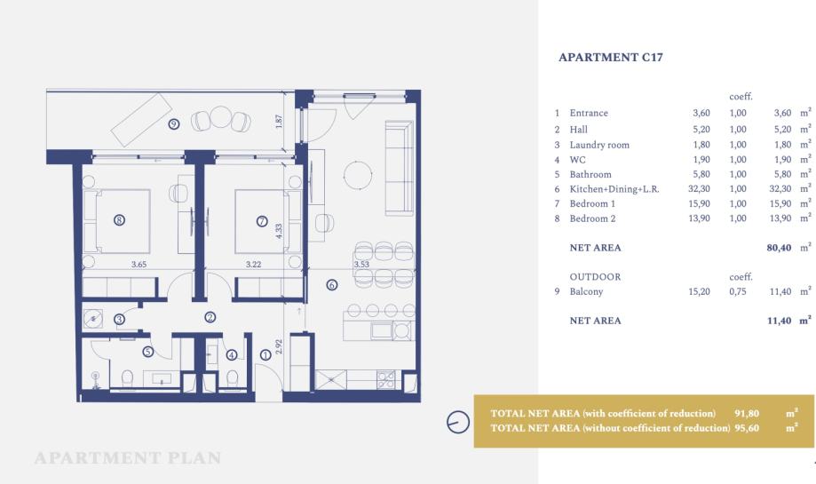 Istria, Savudrija, a modern two-bedroom apartment on the first floor with a net usable area of 80.40 m², located within the Petram Resort. Apartment C17 consists of an entrance area, hallway, laundry room, toilet, bathroom, open-space living room, kitchen and dining area, two spacious bedrooms and...