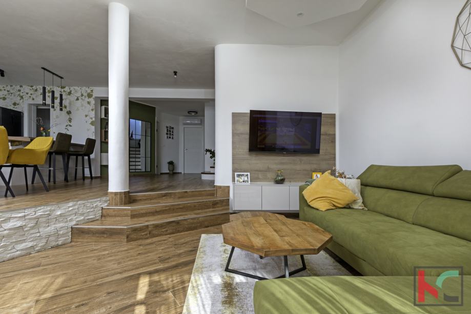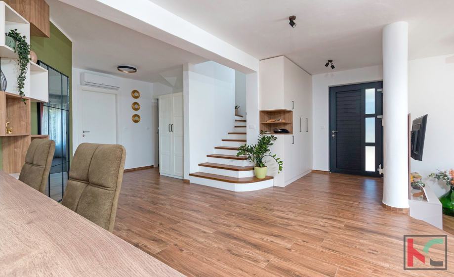 Kuća se proteže na dvije etaže – prizemlje i kat. U prizemlju se nalazi prostrana kuhinja s blagovaonicom, moderno dizajnirana po mjeri s visokokvalitetnim aparatima marke Bosch i Miele. Dnevni boravak otvorenog je tipa i povezan s natkrivenom terasom, idealnom za uživanje u toplim danima. Na ovoj etaži nalazi se i jedna spavaća soba s kupaonicom, zatim hodnik, ostava i praonica rublja.
