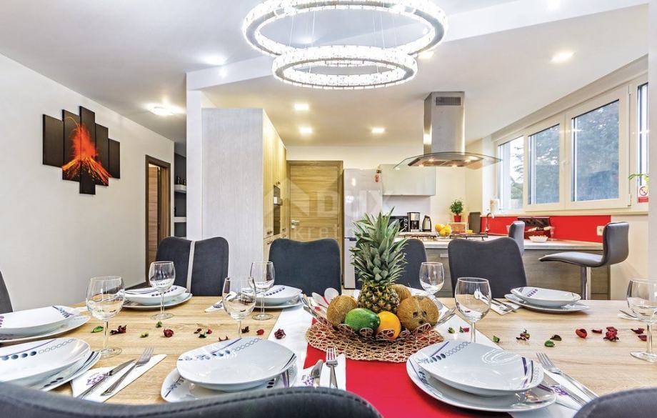 Nekretnina se nalazi na velikom uređenom zemljištu, a ukupne je stambene površine 350 m2. U prizemlju kuće, u koje se može ući na glavni ulaz ili iz garaže, nalaze se ulazni hodnik, kupaonica i ostava dok najveći dio zauzima prostrani dnevni boravak koji je spojen s kuhinjom i blagovaonicom te zonom za opuštanje.