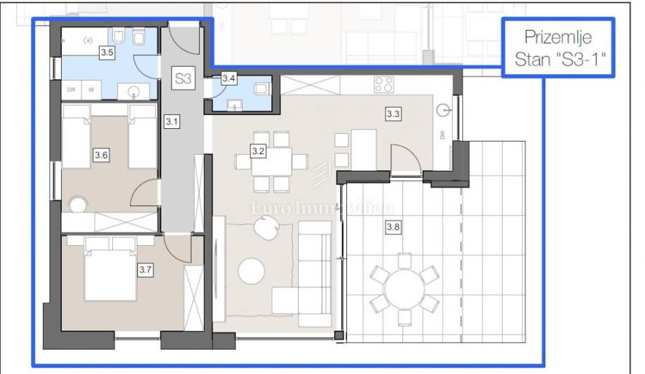 Stan površine 85,50 m² sastoji se od kuhinje, blagovaonice i dnevnog boravka otvorenog koncepta, hodnika, zasebnog WC-a, kupaonice, dvije spavaće sobe te natkrivene terase.
