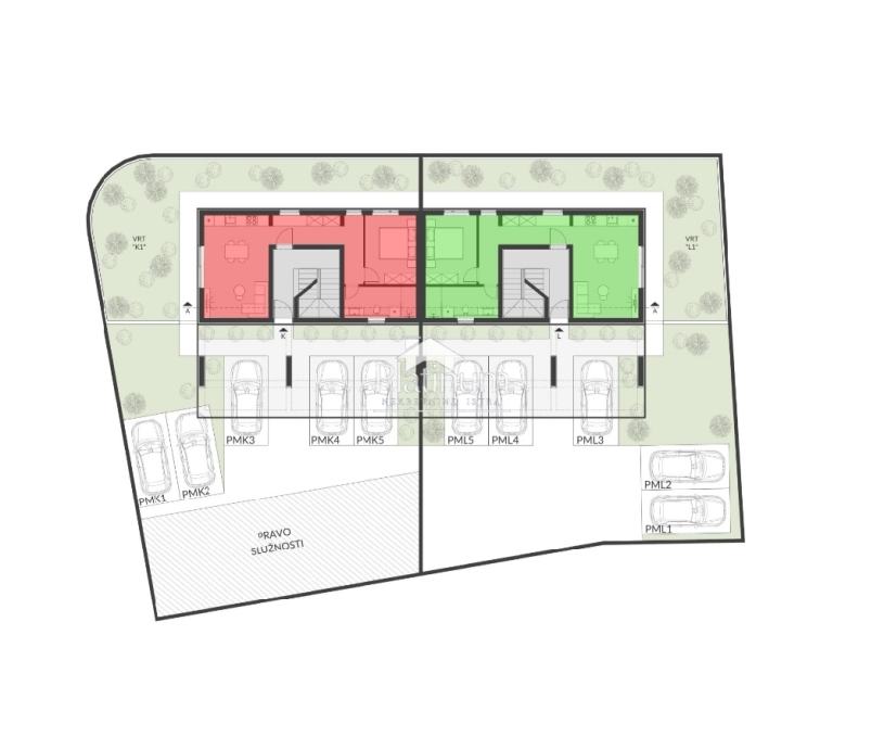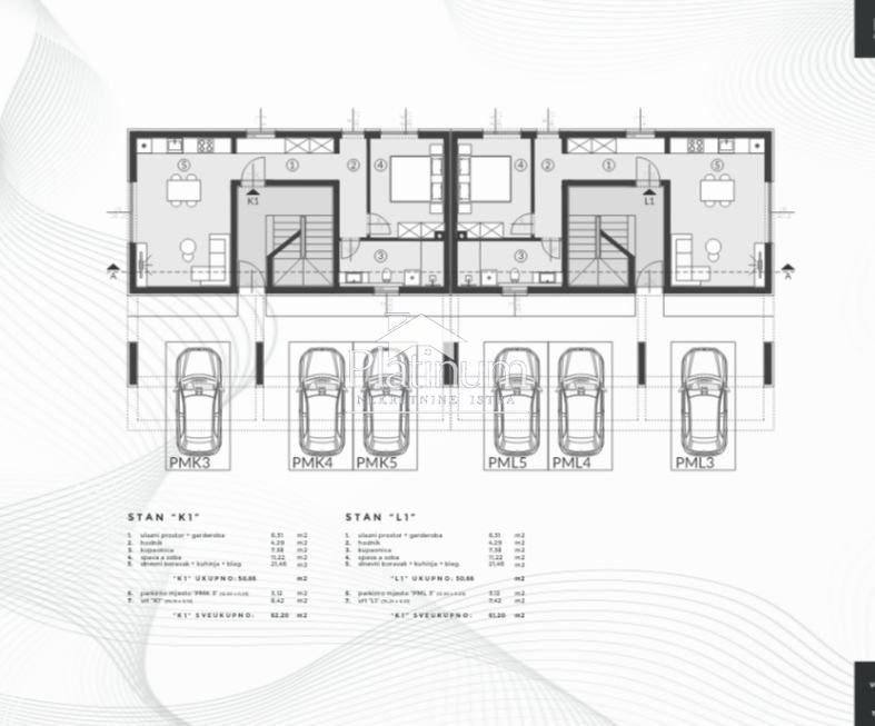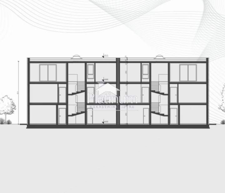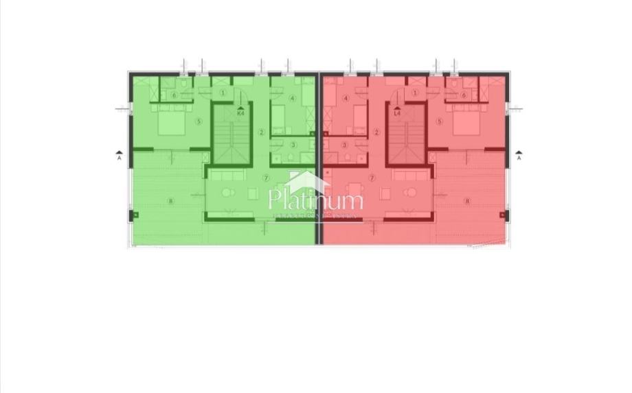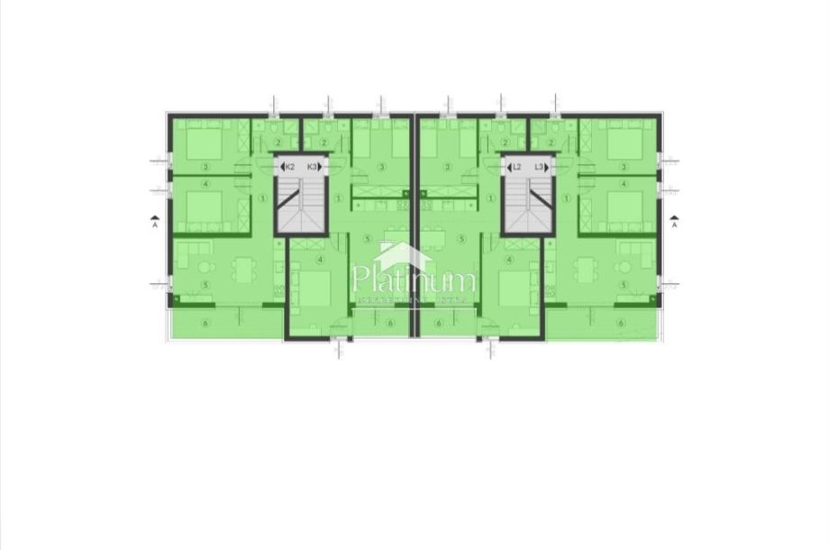 Na prvom katu četiri stana veličine 56.77 m2 s dvije spavaće sobe,56.66 m2 s dvije spavaće sobe.