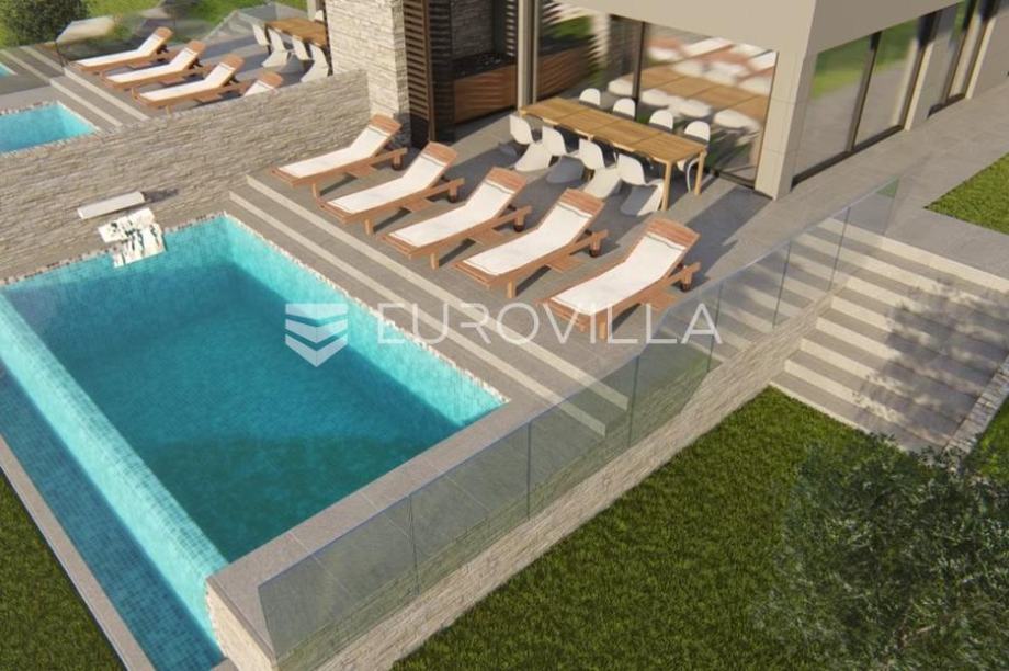 Lokacija ovih villa je jedan od ključnih razloga za investiciju, smještene su na mirnoj poziciji, okružene su s prirodom i kućama za odmor. Radi se o dvije vile svaka sa svojim pojedinačnim ulazom koje su smjestile na istoj parceli i kao takve se prodaju.Ville imaju po 240,50 m2 stambenog prostora, te se protežu na ukupno tri etaže. Na najnižoj etaži u suterenu se smjestila velika prostorija za druženje s raznim društvenim igrama kao što su biljar i stolni nogomet, kupaona, tehnička soba i spremište. Druga etaža vile u prizemlju se sastoji od ulaznog hodnika, open space dnevnog boravka s kuhinjom i blagovaonom, spavaće sobe s WC-om te praonom, prostrane vanjske natkrivene terase s vanjskom kuhinjom s koje Vam se pruža predivan pogled na bazen i prirodu. Na katu se nalaze tri spavaće sobe koje imaju svoja zasebna kupatila, svakako bi nadodali da spavaće sobe imaju direktan izlaz na svoju natkrivenu terasu.Postavljeno je 4 klima uređaja po vili, podno grijanje, aluminijska stolarija s komarnicima. Na okućnicama je smješteno dvorište s velikim bazenom koji služi za osvježenje u ljetnim vrućinama. Ville imaju po tri parkirna mjesta.Ove investicijske vile počinju s gradnjom ove godine, te je planirani završetak 08/2026 godine. Odlična su prilika i za veću obitelj koja bi prilikom boravka htjela imati i dio privatnosti pa se tako mogu smjestiti u dvije kuće.Prodavatelj je firma, te se plaćanje vrši u obrocima po dogovoru sa vlasnikom.Vlasništvo 1/1Bez tereta.Cijena svake kuće pojedinačno iznosi 769.000,00 eura.Cijena svake kuće u roh-bau fazi iznosi 359.000,00 eura.Za više dodatnih informacija Vam stojimo na raspolaganju....