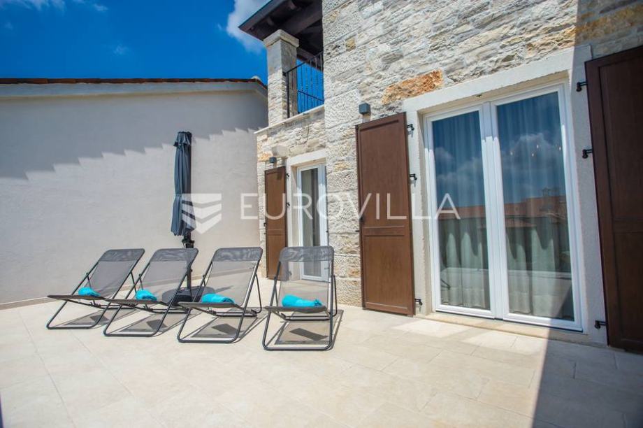 Novoizgrađena kuća smještena na povišenom položaju s lijepim panoramskim pogledom prema zapadnoj obali Istre i prema moru. Nalazi se na rubnom djelu slikovitog srednjovjekovnog gradića Svetoga Lovreča udaljenog 15 km od grada Poreča i 20 km od grada Rovinja Ukupne površine 200 m² na dvije...