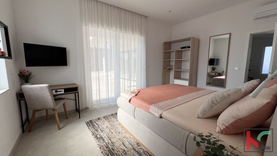 Kamene stepenice vode na prvi kat gdje se nalaze tri spavaće sobe, svaka s vlastitom kupaonicom i izlazom na prostranu terasu. Na terasi uz bazen i sunčalište nalazi se blagovaonski stol i ljetna kuhinja s kaminom na drva i plin, koja će djelomično biti zatvorena i natkrivena čvrstim panelima. Uz ljetnu kuhinju nalazi se dječje igralište. Okoliš vile bit će uređen mediteranskim biljem.