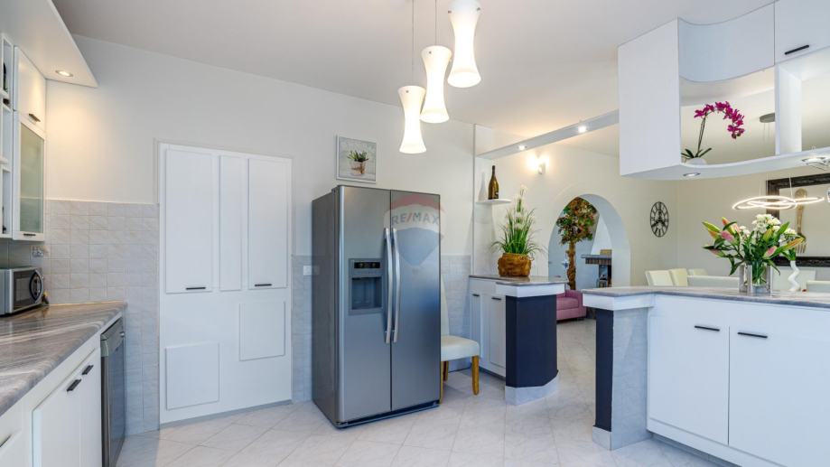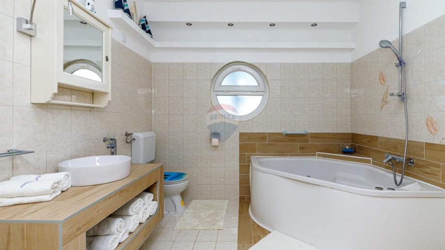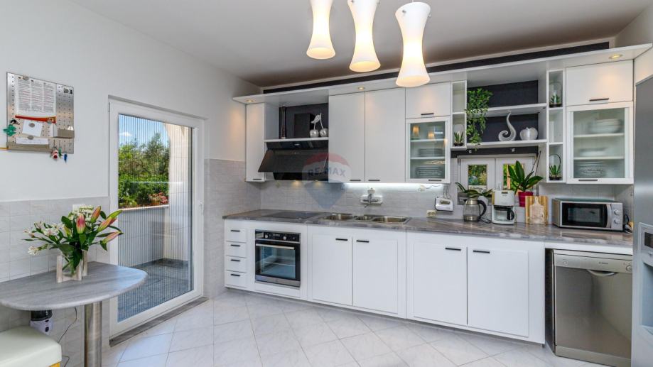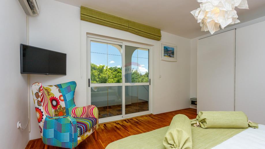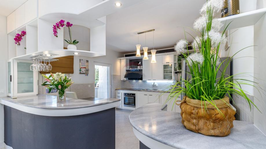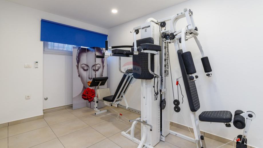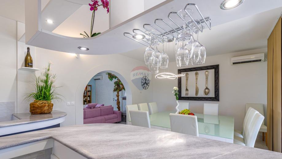 U prizemlju se ulazi u njen privatni ograđeni vrt u kojem se nalazi bazen, jacuzzi i dvije natkrivene terase. U prizemlju kuće se nalazi prostrani dnevni boravak iz kojeg se izlazi na terasu koja je povezana sa vrtom i bazenom. Dnevni boravak je povezan sa kuhinjom i blagovaonom koja također ima svoju terasu. U suterenu je teretana sa sunom. Na međukatu nalazimo sobu sa kupatilom. Vanjskim natkrivenim stubištem penjemo se na kat gdje nalazimo tri sobe, kupatilo i terasu iz koje se proteže predivan pogled prema prirodi i moru.