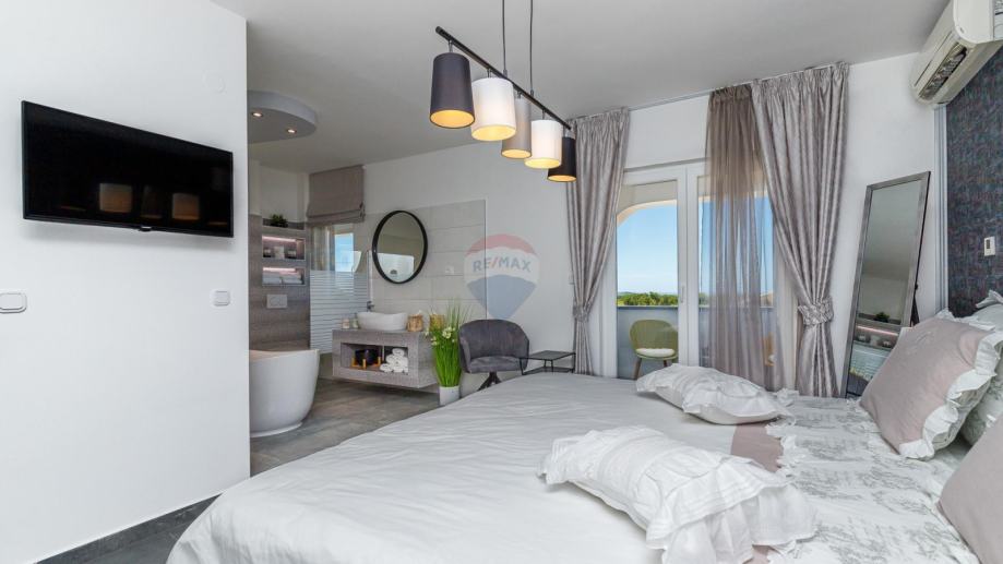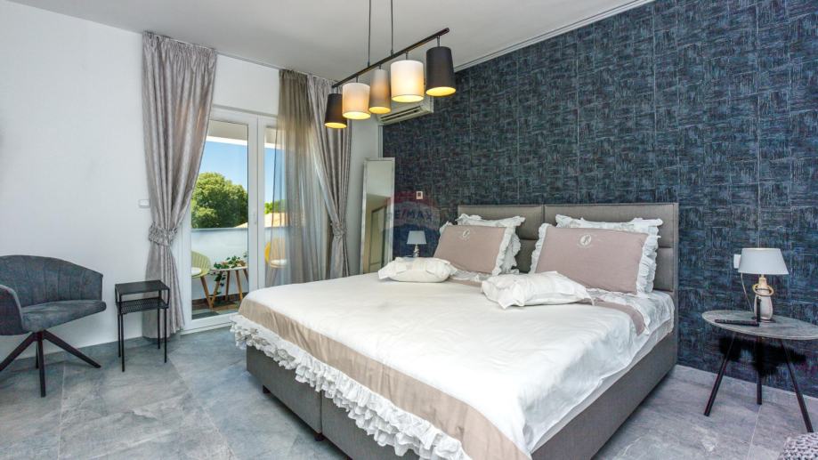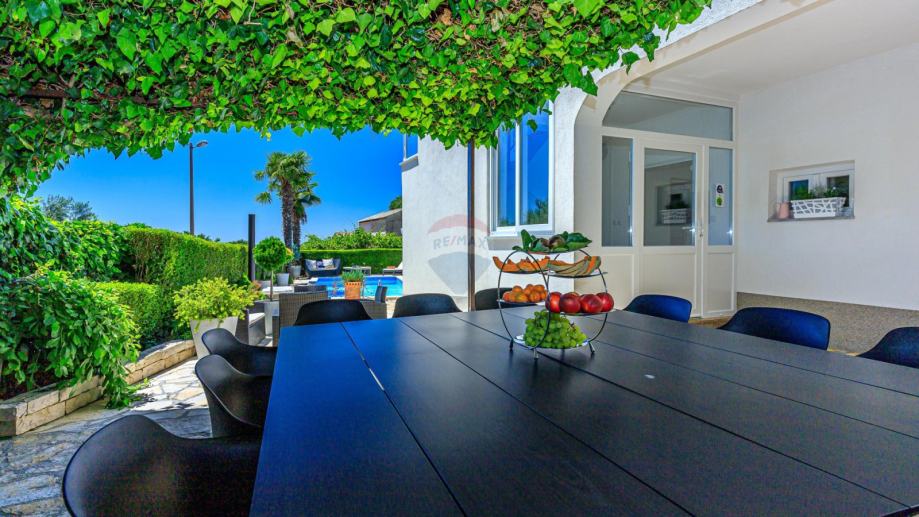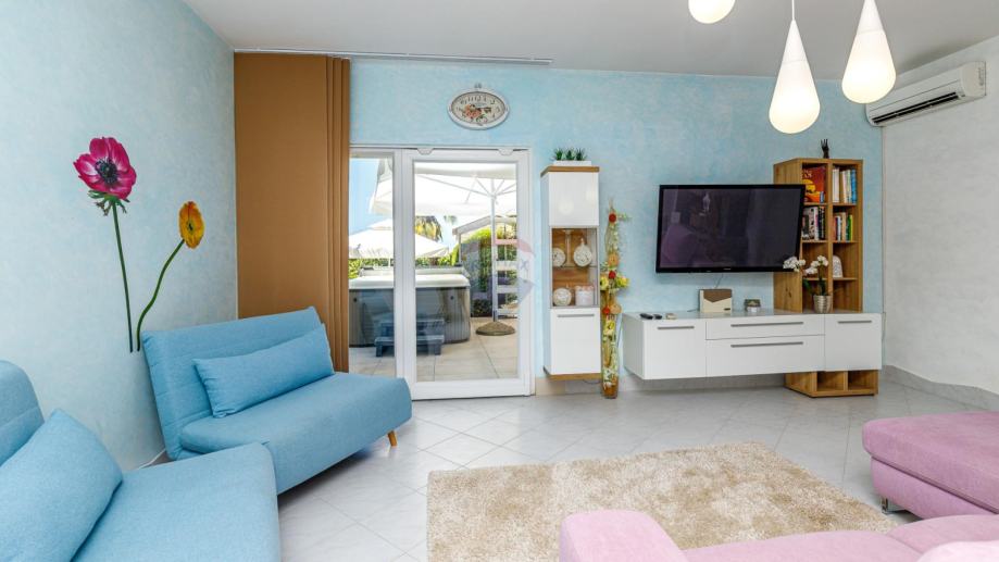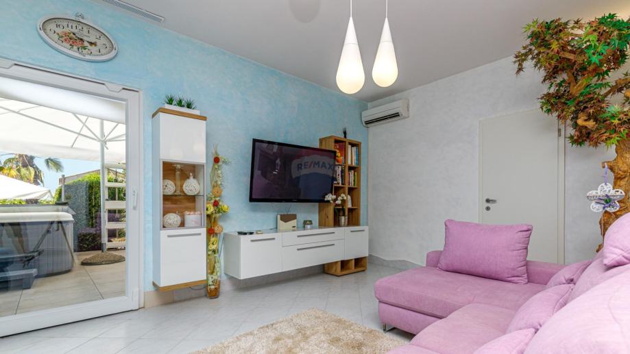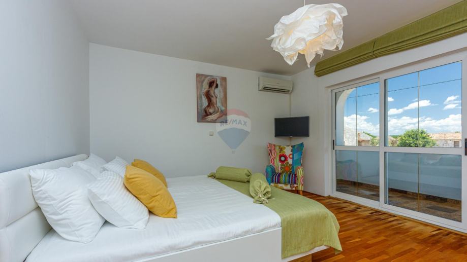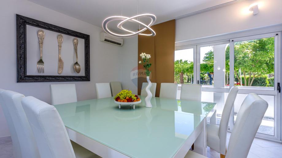 U prizemlju se ulazi u njen privatni ograđeni vrt u kojem se nalazi bazen, jacuzzi i dvije natkrivene terase. U prizemlju kuće se nalazi prostrani dnevni boravak iz kojeg se izlazi na terasu koja je povezana sa vrtom i bazenom. Dnevni boravak je povezan sa kuhinjom i blagovaonom koja također ima svoju terasu. U suterenu je teretana sa sunom. Na međukatu nalazimo sobu sa kupatilom. Vanjskim natkrivenim stubištem penjemo se na kat gdje nalazimo tri sobe, kupatilo i terasu iz koje se proteže predivan pogled prema prirodi i moru.