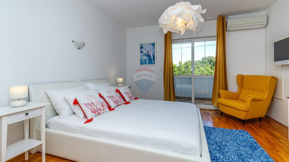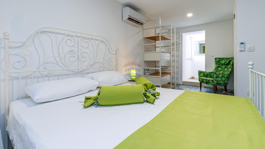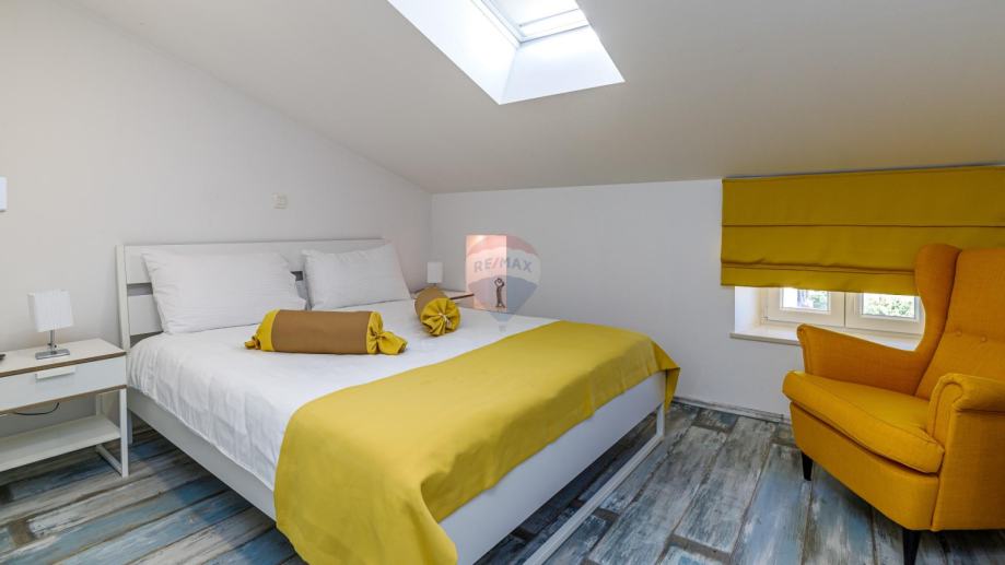 U potkrovlju se nalazi potpuno odvojen stan koji je za urediti. Stan ima predivan pogled prema moru.