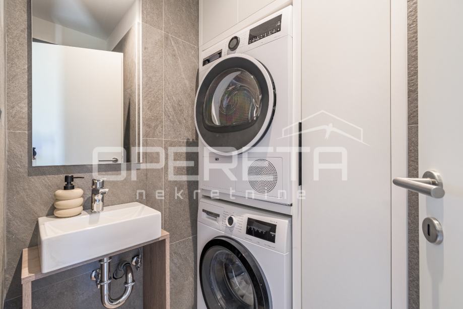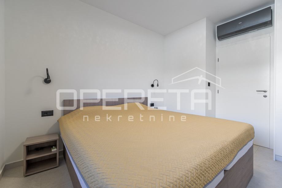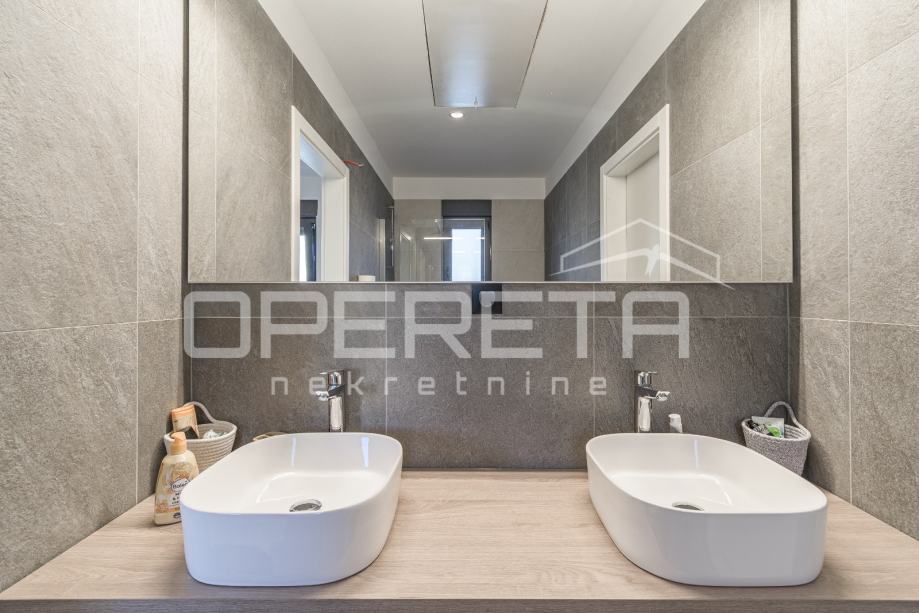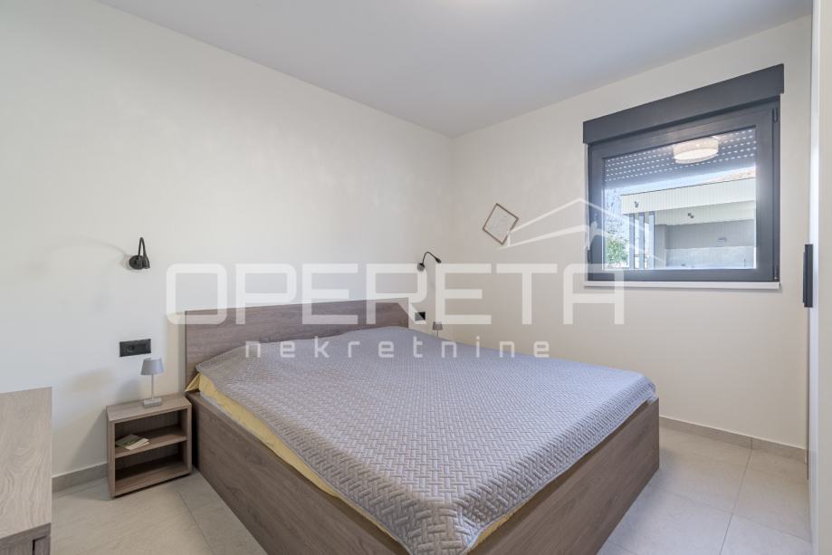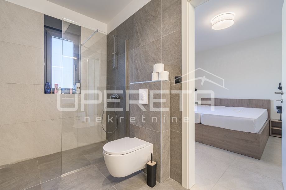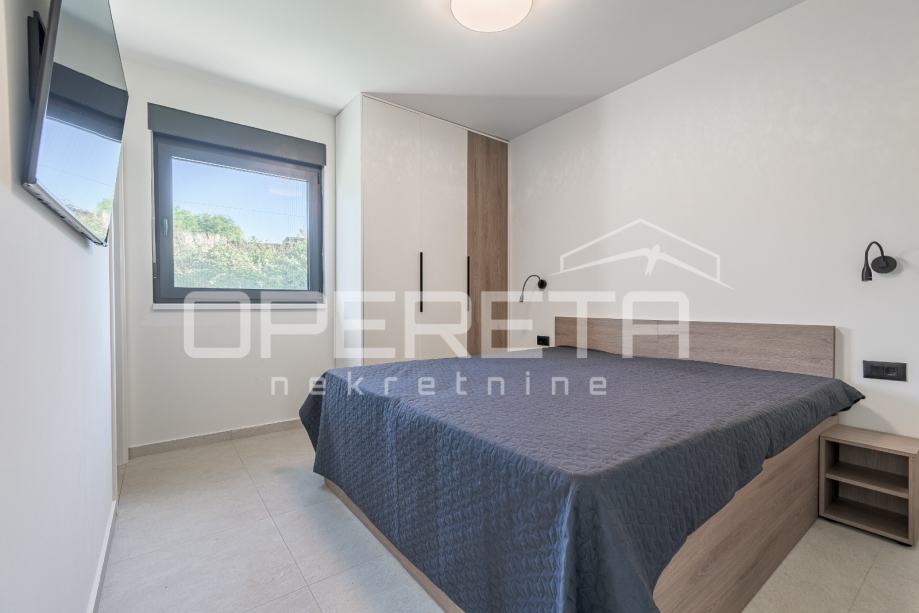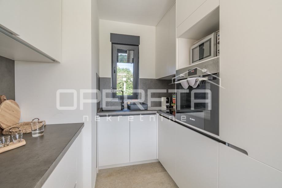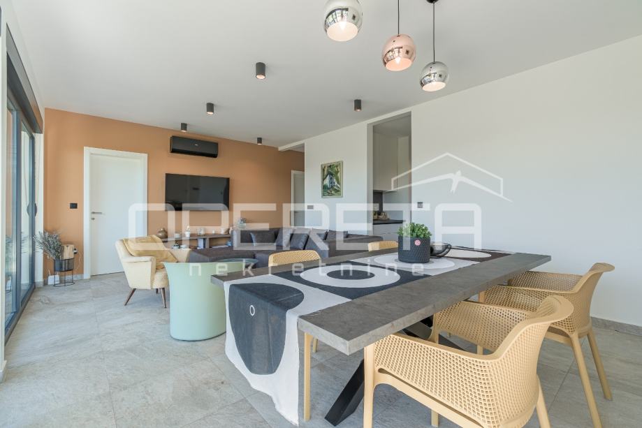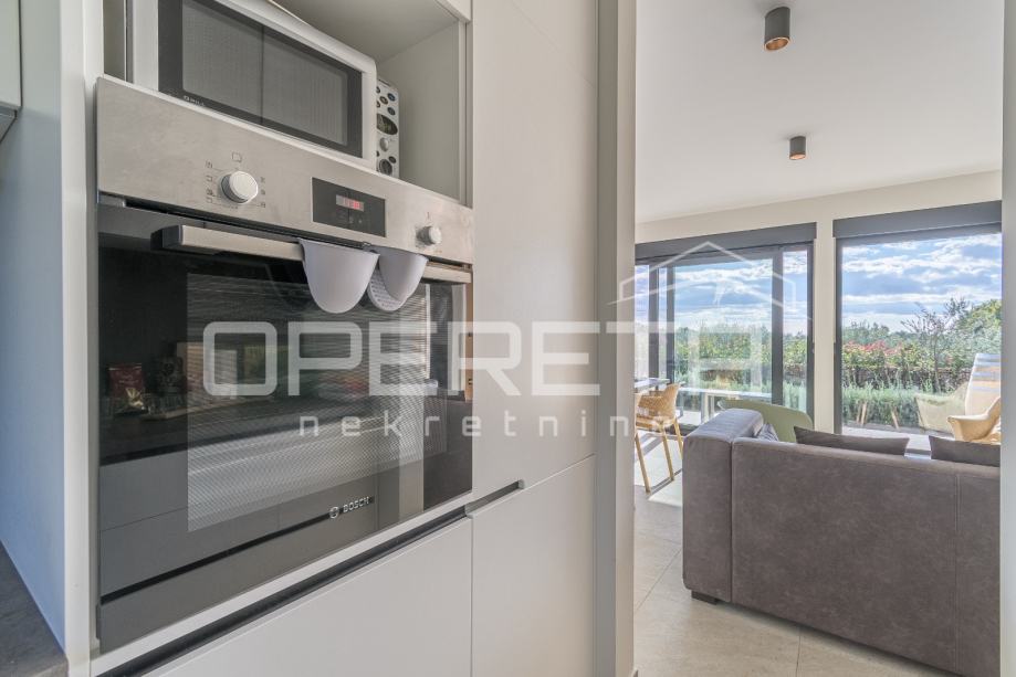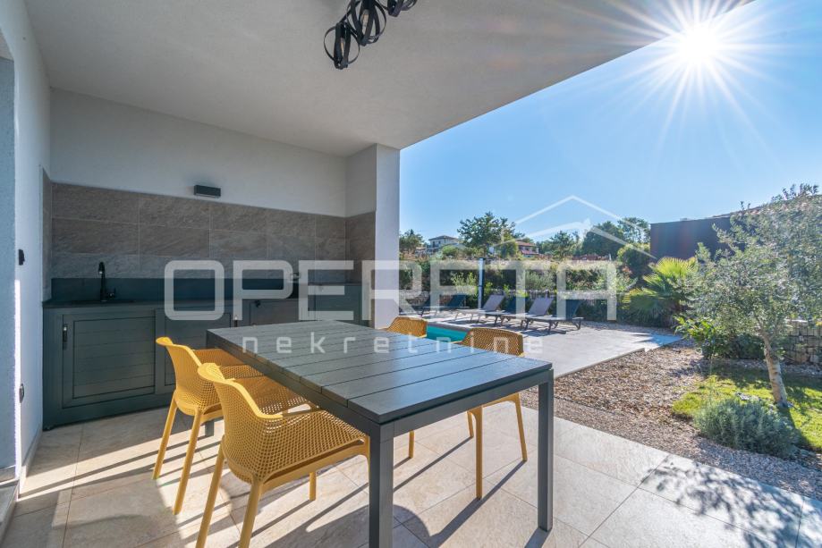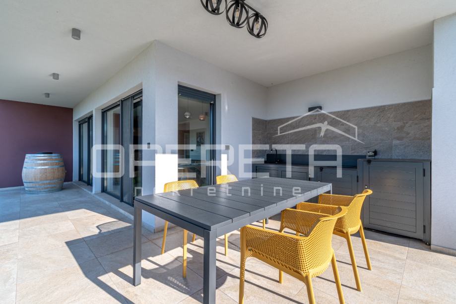 Unutrašnjost kuće nudi tri spavaće sobe, dvije kupaonice te dodatni WC i vešeraj. Kuća ima energetski razred A. U potpunosti je namještena vrhunskim modernim namještajem i uređajima te pažljivo osmišljena kako bi svaki kutak pružao osjećaj doma i opuštenosti. Prostrana natkrivena terasa sadrži ljetnu kuhinju s roštiljem, frižiderom, sudoperom i praktičnim radnim površinama, te veliki blagovaonski stol.