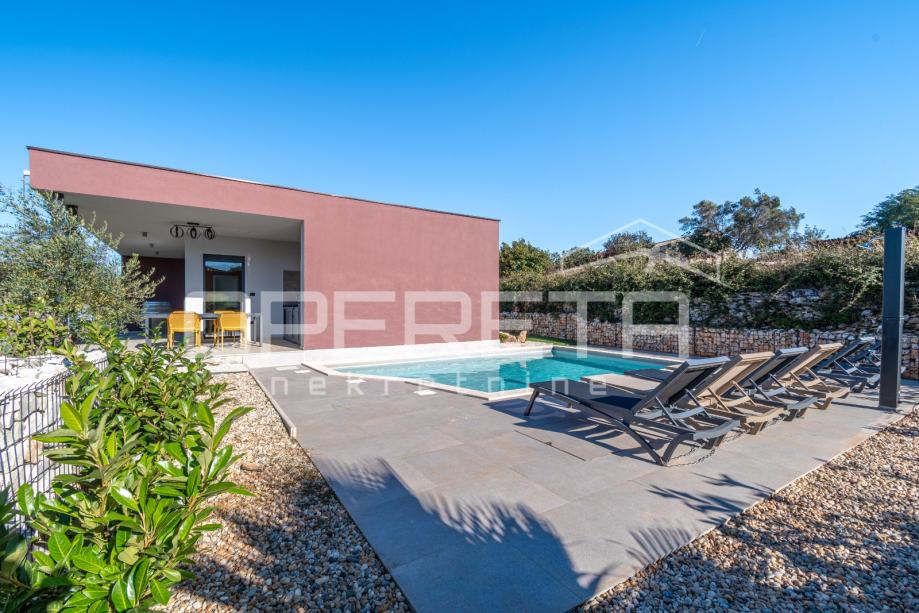 Sadrži i bazen od 27 m2 s prostranim sunčalištem od 48 m2.
