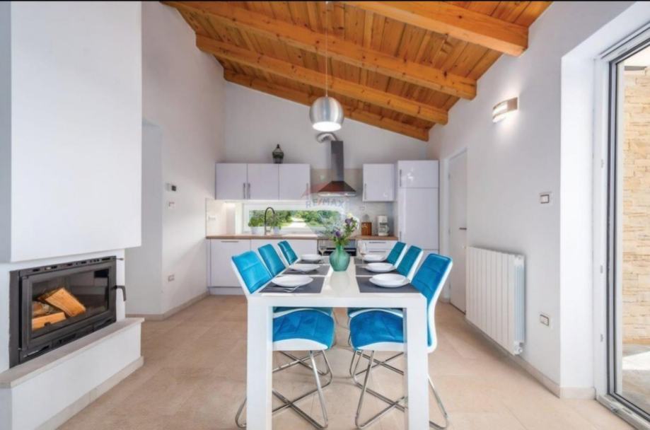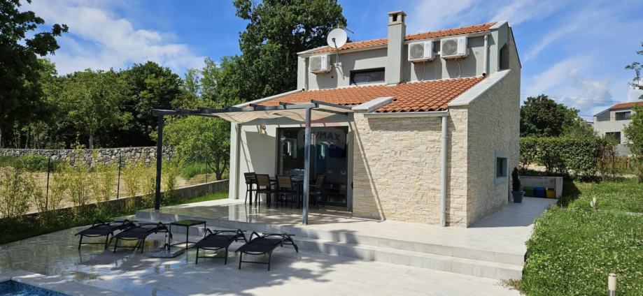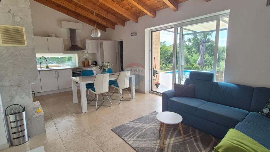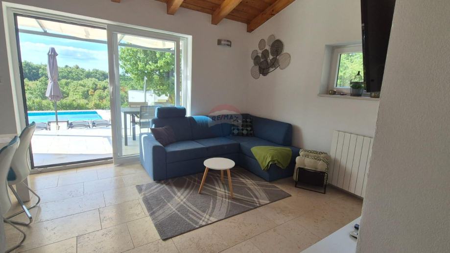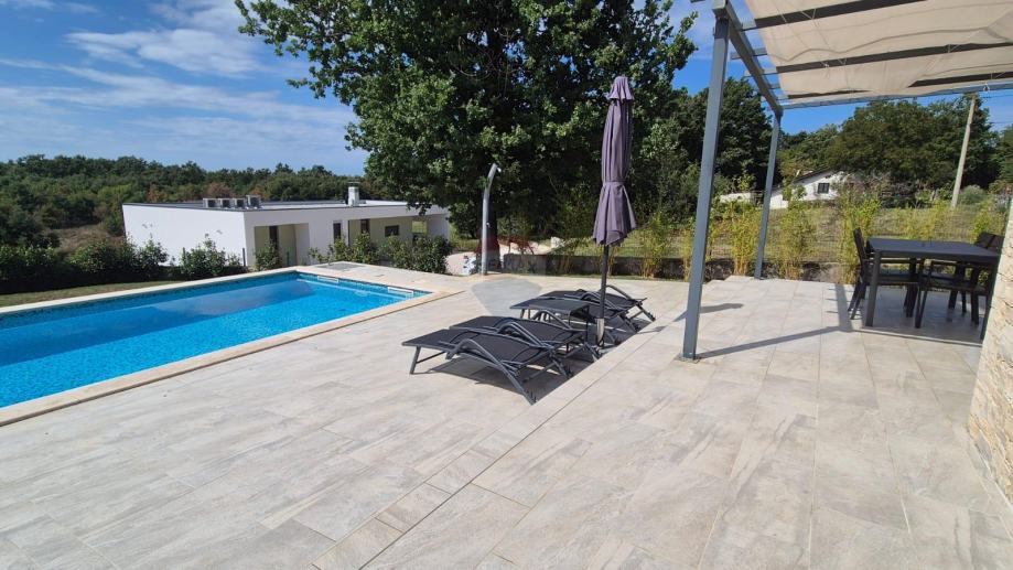 Iz dnevnog boravka izlazi se na terasu koja je povezana sa plažom bazena i samim bazenom.
