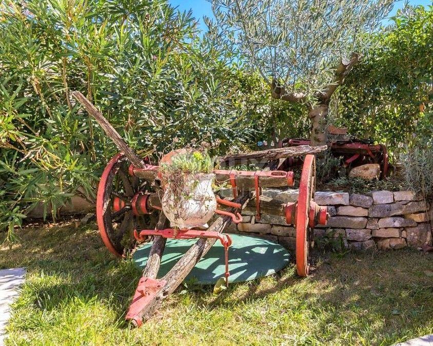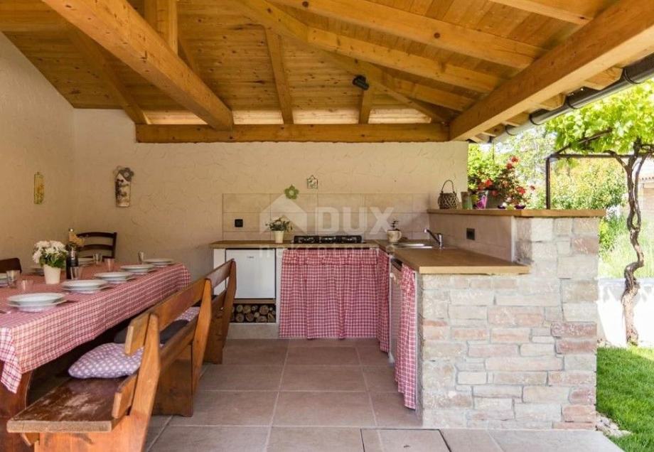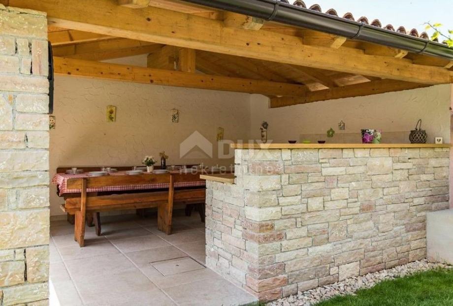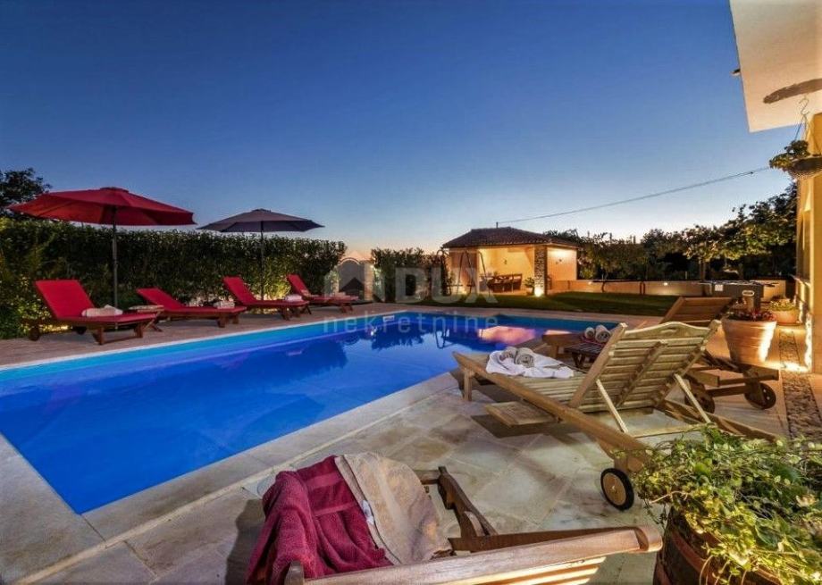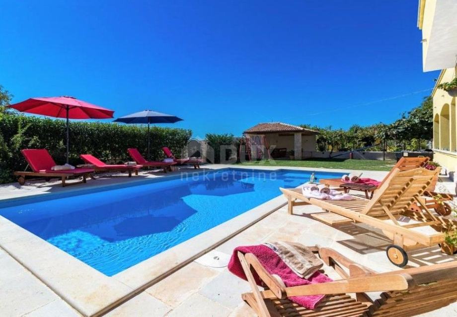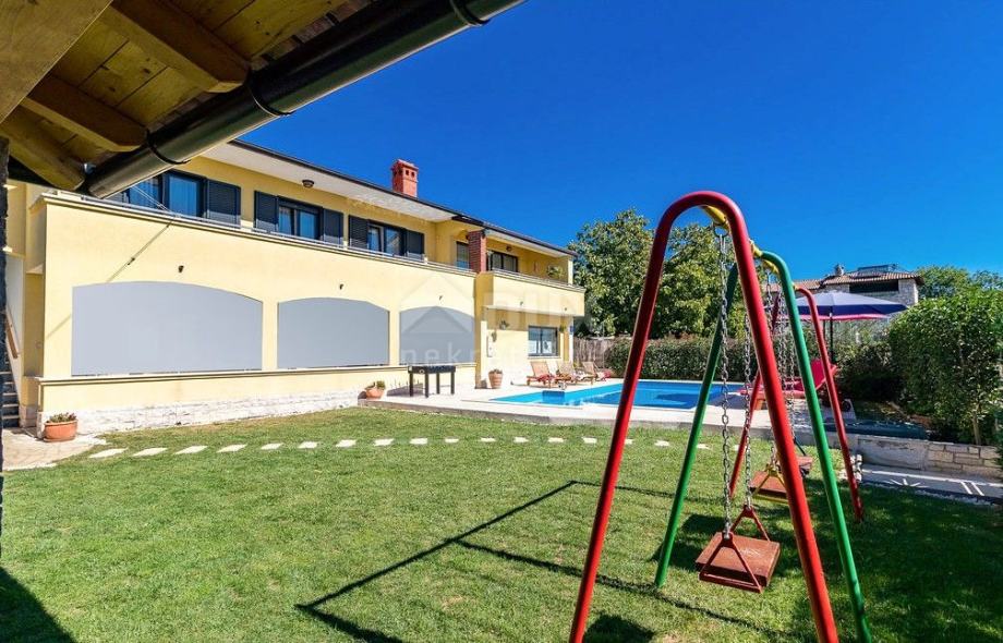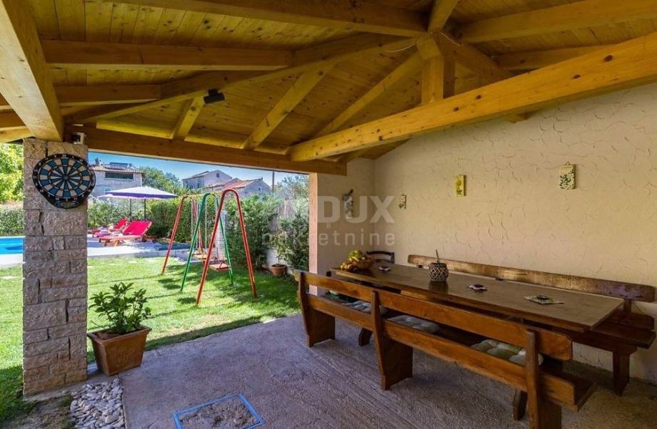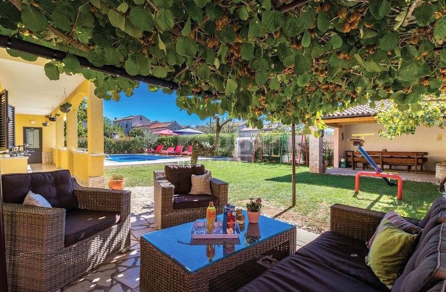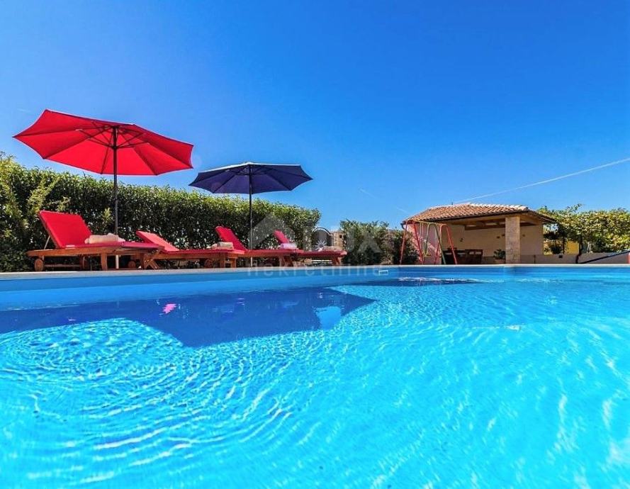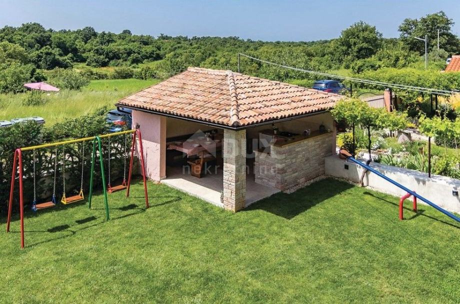 Uz kuću se nalazi bazen površine 42 m² sa sunčalištem, natkrivena ljetna kuhinja i dječje igralište. Okućnica je uređena i ograđena.
