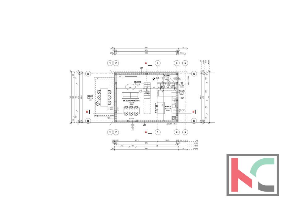 U prizemlju kuće su predviđene sljedeće prostorije: dnevni boravak, blagovaonica i kuhinja kao open space prostor, ostava, toalet i hodnik.