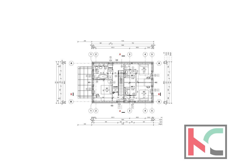 Na kat se dolazi unutarnjim stubištem, a na katu su predviđene 3 spavaće sobe, svaka sa vlastitim kupaonicama.