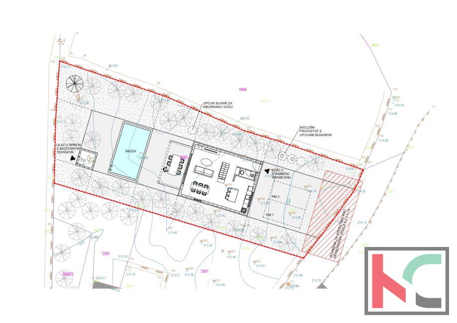 Na navedenom zemljištu je predviđena gradnja samostojeće stambene građevine, prizemlje i kat, 120m2 neto, pomoćnih građevina - vanjski bazen, spremište sa bazenskom tehnikom, biološki pročistač, predviđena su 2 parkirna mjesta.