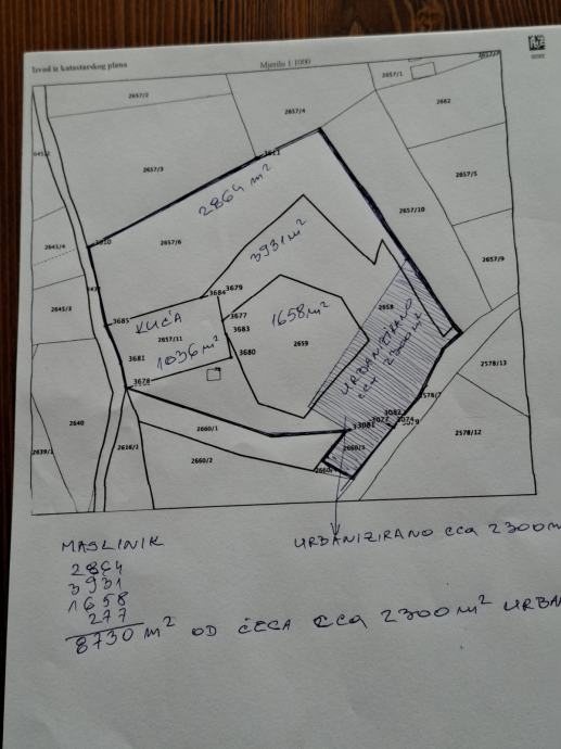 • Imanje je površine 9.850 m², zasađeno s 120 maslina (starosti 3 – 12 godina), te bademima, trešnjama i smokvama. Od ukupne površine, 2.300 m² zemljišta je urbanizirano, s mogućnošću dodatne gradnje