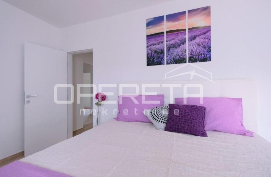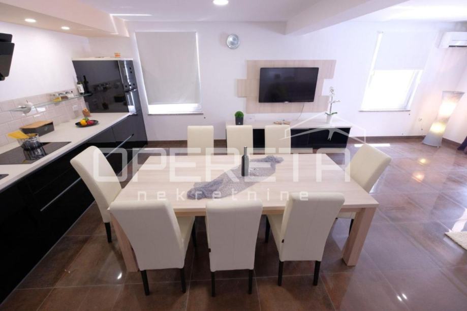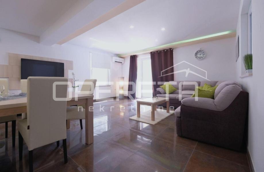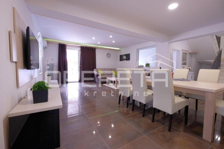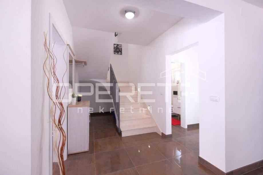 U prizemlju se nalazi hodnik, dnevni boravak sa kuhinjom i blagavaonicom sa izlazom na natkrivenu terasu, spavaća soba i jedna kupaonica. Na katu su još tri spavaće sobe, balkon i dvije kupaonice.