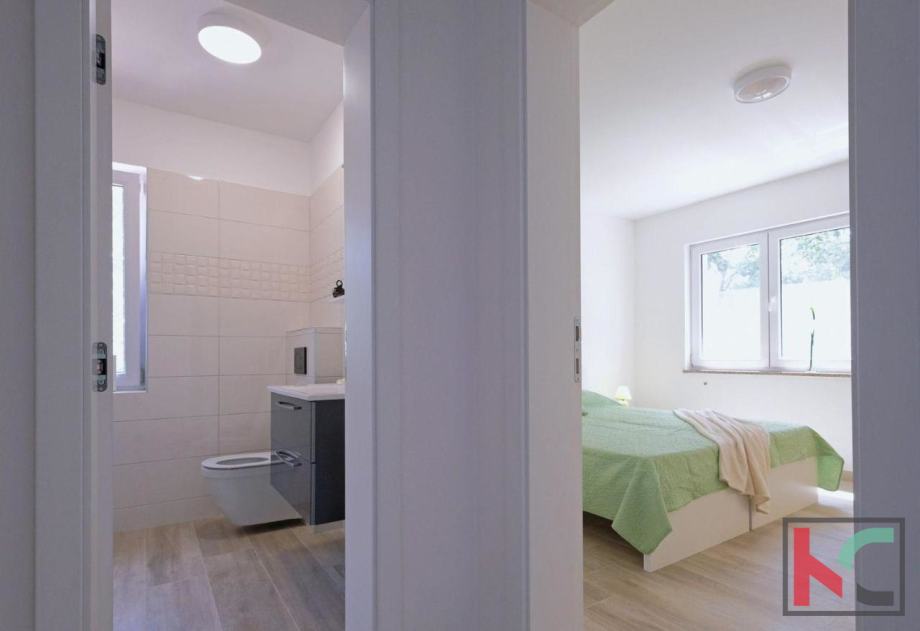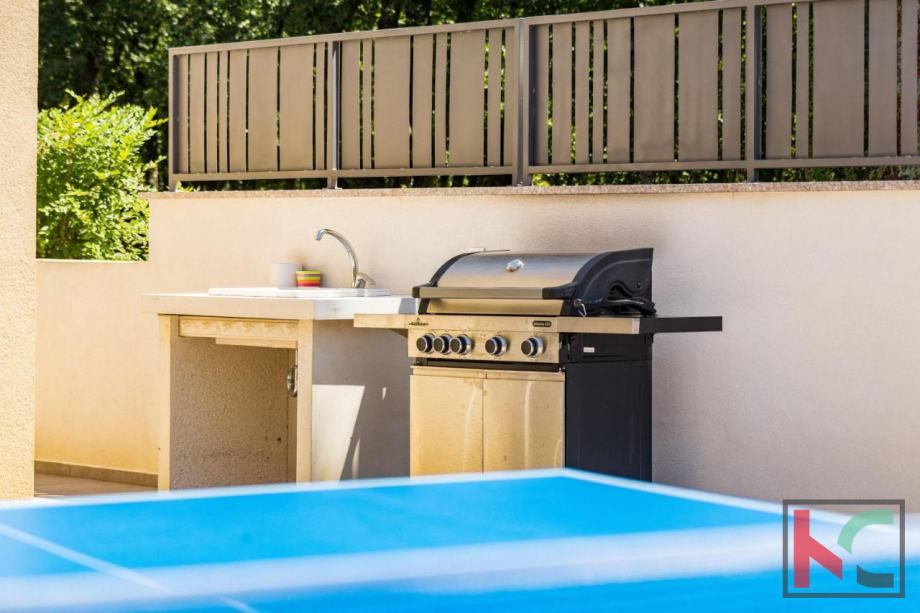 U prizemlju se ulazi u hodnik, tu se smjestila jedna kupaonica, jedna spavaća soba te "open space" kuhinja sa izlazom na natkrivenu terasu, popločeno sunčalište i bazen.