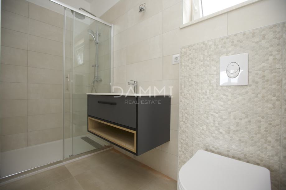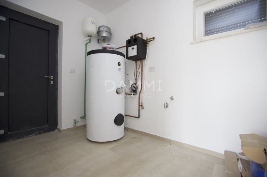 Kuća je opremljena podnim grijanjem na struju, klima uređajima, pvc stolarijom,električnim roletama.